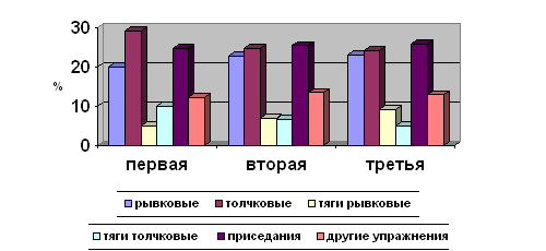 Рис.2. Распределение объема работы по группам упражнений тяжелоатлетов-ветеранов различных групп весовых категорий в подготовительном мезоцикле (%). Анализ показывает, что в подготовительном мезоцикле рывковых упражнений больше в I-й группе, чем во II-й (на 1,4 %) и III-й (на 0,9 %), толчковых во II-й группе больше, чем в I-й (на 1,1 %) и III-й-(на 3,8 %), тяг рывковых во II-й больше, чем I-й (на 1,4 %) и III-й (на 1,8 %), тяг толчковых в I-й группе больше, чем II-й (на 4,3 %) и III-й (на 2,7 %), приседаний в III-й группе больше, чем II-й (на 1,8 %) и I-й (на 3,7 %), других упражнений (наклоны, жимовые) в III-й группе больше, чем II-й (1,7 %) и I-й (на 3,0 %). Анализ свидетельствует, что в подготовительном мезоцикле 51,6 % тяжелоатлетов - ветеранов больше всего тренируются в зоне интенсивности 80 - 89 %; 37,5 % - соответственно - 70 - 79 %; 7,8 % - 60 - 69 % и 3,1 % - 90 - 99 %. В соревновательном мезоцикле рывковых упражнений в III-й группе больше, чем во II-й (на 0,4 %) и I-й (на 3,2 %), толчковых упражнений в I-й группе больше, чем во II-й (на 4,3 %) и III-й (5,0 %), тяг рывковых в III-й группе больше, чем во II-й (на 2,1 %) и I-й (на 4,1 %), тяг толчковых в I-й группе больше, чем во II-й (на 3,4 %) и III-й (на 5,0 %), приседаний в III-й группе больше, чем II-й (на 0,4 %) и I-й (на 1,1 %), других упражнений во II-й группе больше, чем I-й (на 1,2 %) и III-й (на 0,6 %). Анализ данных показывает, что у атлетов различных групп весовых категорий в подготовительном и соревновательном мезоциклах проводились тренировочные занятия со скоростной направленностью - объем тяг и приседаний в подготовительном мезоцикле составлял 39,3; 39,7 и 39,9 %; в соревновательном мезоцикле - 39,7, 39,0 и 39,9 % что подтверждается исследованиями ведущих специалистов [3]. Рис.3. Распределение объема работы по группам упражнений (%) у тяжелоатлетов-ветеранов различных групп весовых категорий в соревновательном мезоцикле Ниже приведено распределение упражнений по характеру работы в подготовительном и соревновательном мезоциклах подготовки у тяжелоатлетов-ветеранов, высококвалифицированных тяжелоатлетов (А.Н. Воробьев, 1988) и спортсменов сборной команды Украины (В.Г. Олешко, 1999) (табл. 1 - 3). Таблица 1 Распределение упражнений по характеру работы в подготовительных и соревновательных мезоциклах у тяжелоатлетов ветеранов Украины различных групп весовых категорий (%)