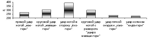 Рис. 1. Показатели абсолютной силы одиночного прямого удара сильнейшей ногой в верхний уровень у каратистов высокой квалификации весовой категории свыше 90 килограммов Таблица 2 Значение коэффициента корреляционной связи силы нанесения шести видов одиночных ударов сильнейшей ногой в верхний уровень и гибкости у каратистов-тяжеловесов высокой квалификации (n=11)