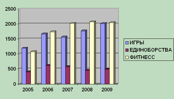 Такая форма организации учебного процесса по физическому воспитанию требует изменения организации структуры кафедры и комплектации штата преподавателей кафедры специалистами по видам спорта в соответствии с целями и задачами, которые приходится решать при такой схеме организации занятий по физическому воспитанию. Непосредственно учебный процесс построен по следующему принципу: на вводном занятии необходимо ознакомить студентов с историей развития физической культуры и спорта в ВУЗе, системой организации физического воспитания в высшем учебном заведении, акцентировав внимание студентов на правах и обязанностях студентов на занятиях по физическому воспитанию. Это вызвано низким уровнем "физкультурной образованности" студентов, приобретённой ими до поступления в ВУЗ в средних учебных заведениях. Целесообразным является также проведение анкетирования студентов с указанием того вида спорта или двигательной активности, которые предположительно выберет студент при распределении на занятия, построенные по секционной форме работы. Первые 6-7 недель для студентов 1-х курсов необходимо использовать в учебном процессе по физическому воспитанию занятия по лёгкой атлетике и общей физической подготовке, во время которых следует организовать проведение первичного тестирования студентов для определения степени развития основных физических качеств: скорости, силы, ловкости. Распределение студентов 1-х курсов в группы физического воспитания по избранному виду спорта или двигательной активности целесообразно проводить после прохождения медицинского осмотра, который проводят специалисты областной студенческой больницы. Студенты старших курсов распределяются в группы физического воспитания по видам спорта (двигательной активности) в начале учебного года. В начале каждого учебного семестра студент, выполняющий учебный план по физическому воспитанию, имеет право перевестись в группу по другому виду спорта (двигательной активности). На протяжении учебного года расписание занятий по физическому воспитанию формируется трижды: в начале учебного года, после распределения студентов первых курсов в спортивно ориентированные группы физического воспитания и в начале второго семестра. Студенты имеют возможность свободного выбора расписания занятий по физическому воспитанию. Существуют определённые сложности в проведении учебных занятий, связанные с тем, что студенты 1-х курсов приступают к занятиям в спортивно ориентированных группах физического воспитания в конце второго месяца занятий и, зачастую, имеют недостаточную подготовку в избранном виде. Особенно это сказывается при проведении занятий по командным игровым видам спорта, а также по единоборствам. На диаграмме 1 приведено распределение студентов Харьковского национального университета имени В.Н. Каразина по циклам физического воспитания за 5 лет. Диаграмма 1. Распределение студентов ХНУ имени В.Н. Каразина в учебные циклы физического воспитания Анализ распределения за 5 лет показал, что во время учёбы в университете 41,7% студентов избрали для себя в качестве средств физического воспитания игровые виды спорта, 12,9% - единоборства, а 45,4 избрали оздоровительное направление физического воспитания в цикле "Фитнесс". В Львовском национальном университете имени