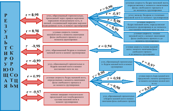 ◘ - модельные показатели; □ - показатели квалифицированных шорт-трековиков. Выводы. 1. Изучение литературных источников позволило установить, что вопросы моделирования спортивной техники находятся в поле зрения ученых не один десяток лет. С одной стороны это, позволило в различных видах спорта, накопить огромный практический опыт по вопросам моделирования и совершенствования спортивной техники, с другой же стороны это способствовало повышению эффективности техники двигательных действий. 2. Необходимость моделирования спортивной техники и собственно физических упражнений в спортивной тренировке не вызывает сомнений у большинства исследователей. Моделирование техники каждого физического упражнения должно начинаться с его описания, установления принципов, критериев, вычленения элементов системы, определения взаимодействия между ними. В педагогическом процессе моделирование необходимо, прежде всего, для того, чтобы обучаемый успешно овладел информацией, необходимой ему для освоения того или иного навыка. В этой связи модель должна быть упрощена настолько, насколько возможно получение при этом достоверной информации об изучаемом объекте или явлении. 3. Данные специально-методической литературы свидетельствуют о том, что сложная система физического упражнения может быть описана конечным множеством моделей, каждая из которых позволяет получить некоторые представления только об отдельных его сторонах. Подход, основанный на выявлении дискриминативных признаков техники двигательных действий, соответствуя вышеотмеченным требованиям, позволяет расширить представление о требуемом выполнении того или иного технического элемента, что значительно облегчает работу тренера и спортсмена. Разработанная и, в ходе педагогического эксперимента, успешно апробированная модель техники бегового шага по прямой в шорт-треке, созданная по такому же принципу, подтверждает правомерность данного положения. 4. Корреляционный анализ между результирующей скоростью ОЦМ тела шорт-трековиков, с одной стороны, и биомеханическими характеристиками, с другой, выявил шесть показателей, которые вошли в статистическую модель бега по прямой: угловая скорость бедра маховой ноги с момента окончания фазы свободного проката и до момента группировки; угол, образованный горизонталью и бедром маховой ноги в момент постановки ноги на лед; угол, образованный бедром и голенью маховой ноги в момент группировки; угловая скорость голени маховой ноги с момента окончания фазы свободного проката и до момента группировки; угол (во фронтальной плоскости), образованный горизонталью, проходящей через верхнюю переднюю правую подвздошную ость, и линией, соединяющей верхние передние подвздошные ости в момент группировки; момент инерции относительно продольной оси тазобедренного сустава маховой ноги в момент группировки (Rгр= 0,85; R р= от 0,90 до 0,99).Перспективы дальнейших исследований связаны с разработкой модельных характеристик техники квалифицированных спортсменов с использованием современных систем регистрации и анализа двигательных действий. Литература. 1. Гамалий В.В. Координация мышечных напряжений как составляющая техники двигательных действий человека / В.В. Гамалий // Наука в олимпийском спорте. - 2008. - №1 - С.102 - 105. 2. Воронов А.В. Имитационное биоме