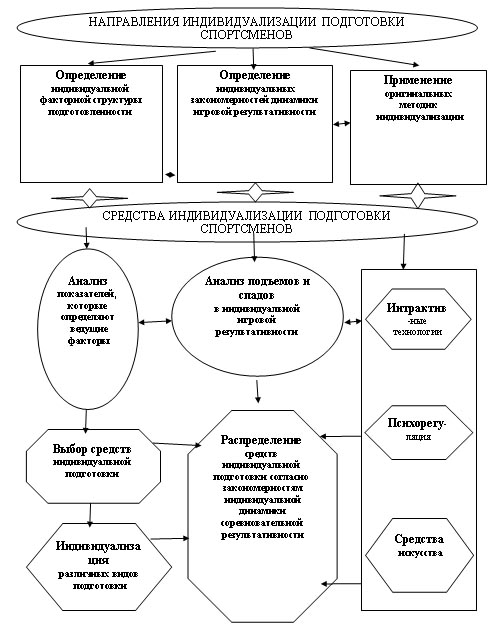 Все указанные положения концепции индивиудализации основываются на аналогах и закономерностях, существующих в неживой и живой природе, основываются на положениях системного подхода [1, 2, 3, 5]. Комплексное применение разработанных методов индивидуализации было реализовано в системе средств индивидуальной подготовки спортсменов в игровых видов спорта. Система средств и методов индивидуализации учебно-тренировочного процесса спортсменов в игровых видах спорта заключалось в следующих положениях. 1. При разработке индивидуальных программ подготовки акцент делался на развитие ведущих факторов в индивидуальной факторной структуре подготовленности спортсменов. Для каждого спортсмена определялись группы ведущих и отстающих факторов в индивидуальной структуре подготовленности. Факторы, составляющие в сумме более 50% в индивидуальной структуре подготовленности, обозначались как ведущие, остальные факторы - отстающие. Согласно разработанным моделям взаимосвязи развития различных сторон подготовленности, на развитие ведущих факторов отводилось 60-80% индивидуальной подготовки, а на развитие отстающих факторов - 20-40%. Акцент на развитие ведущих факторов увеличивался по мере приближения к соревновательному периоду. В соревновательном периоде соотношение средств, направленных на развитие ведущих и отстающих факторов составляло 70:30. При комплектовании стартовых составов команд, проведении замен в игре, формировании пар и "троек" на тренировках учитывались данных кластерного анализа относительно степени "схожести" игроков и разделению их на группы. В зависимости от задач тренировки и особенностей конкретной игры формировались согласованно действующие группы как из "похожих" игроков, так и из различных. 2. При составлении индивидуальных программ подготовки, а также при комплектовании игровых составов команд учитывались индивидуальные закономерности "подъемов" и "спадов" соревновательной эффективности. В периоды "подъемов" игрокам предлагались более нагрузочные упражнения, в периоды "спадов" увеличивалось применение средств восстановления работоспособности, снижались нагрузки, увеличивался относительный объем применения средств, направленных на развитие ведущих факторов индивидуальной подготовленности, до 75-80%, более широко применялись разработанные относительно универсальные средства индивидуализации учебно-тренировочного процесса. 3. Разработанные методы применения средств мультимедиа-технологий, психорегулирующей тренировки, средств искусства и других способов активизации сознания применялись в зависимости от особенностей и склонностей спортсменов, а также в связи с особенностями индивидуальной факторной структуры подготовленности и закономерностей динамики соревновательной результативности. Согласно разработанной нами концепции, система индивидуализации предполагает применение следующих методов: метод определения структуры подготовленности спортсменов и выявление ведущих факторов в структуре подготовленности; метод определения индивидуальных закономерностей соревновательной результативности, метод создания оригинальных методик индивидуализации, помогающих спортсмену раскрыть свой потенциал. Из этих направлений вытекают соответствующие средства индивидуализации учебно-трениров