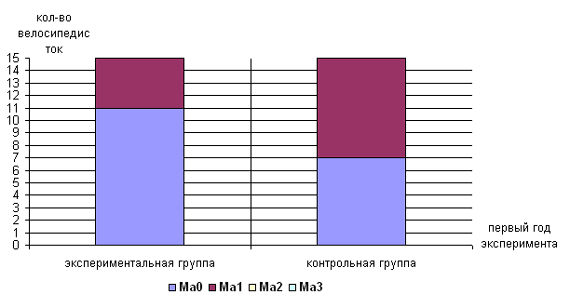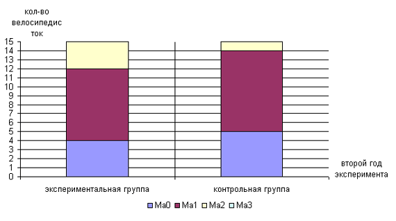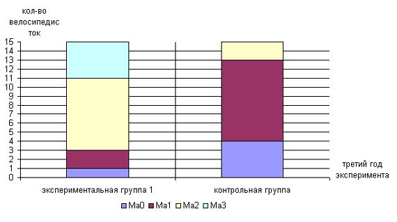 В результате проведенного трехлетнего эксперимента нами выявлено, что под воздействием физических нагрузок по разному происходит становления овариально-менструального цикла по типу телосложения девушки. Так в первый год исследования установлено, что в экспериментальной группе у 4 девушек прослеживалось менархе, тогда как в контрольной группе у 8 девушек (рис.1.). Рис.1. Становление менструальной функции в исследуемых группах в первый год эксперимента (n=15) Ме 0-отсутствие менструаций; Ме1-1-2 менструации (менархе); Ме2-нерегулярные менструации; Ме3-регулярные менструации.Во второй год исследований становление овариально-менструальной функции в экспериментальной группе прослеживалось у 9 спортсменок, при этом в контрольной группе всего у 6 девушек (рис.2.). Рис.2. Становление менструальной функции в исследуемых группах во второй год эксперимента (n=15) Ме 0-отсутсвие менструаций; Ме1-1-2 менструации (менархе); Ме2-нерегулярные менструации; Ме3-регулярные менструации.В третий год исследования цикличность работы яичников прослеживалась в экспериментальной группе у 12 девушек, однако в контрольной группе менструация прослеживалась всего у 3 спортсменок (рис.3.). Рис.3. Становление менструальной функции в исследуемых группах в третий год эксперимента (n=15) Ме 0-отсутсвие менструаций; Ме1-1-2 менструации (менархе); Ме2-нерегулярные менструации; Ме3-регулярные менструации.Таким образом, применение нашей методики построения мезоциклов (28дн) во второй год тренировочного процесса, позволило установить цикличность работы яичников девушкам интерсексуального и атлетического типа телосложения. Выводы