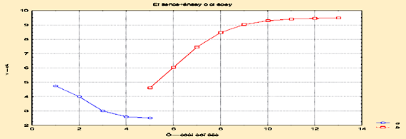 Рис. 1. Обратная логистическая функция. Снижение силы разгибателя предплечья (Y) у гимнастов 7-8 лет после выполнения концентрированных силовых нагрузок с периодом восстановления больше 24 часов (X, 1-5 тренировки), (а). Логистическая функция. Нарастание силы разгибателей предплечья (Y) у гимнастов 7-8 лет после применения силовых нагрузок благоприятных проявлению максимальных усилий с периодом восстановления 24 часа (X, 6-13 тренировки), (b).