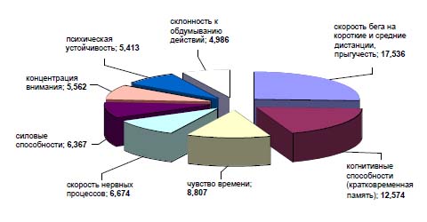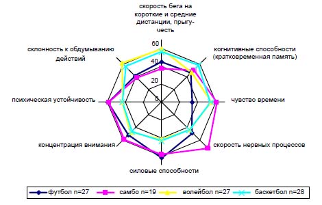 Рис. 2. Индивидуальные факторные модели комплексной подготовленности студентов - представителей разных спортивных специализаций (представлены средние значения индивидуальной выраженности факторов для представителей каждой спортивной специализации) При характеристике данного фактора в качестве ключевого показателя мы взяли показатель ошибки при воспроизведении заданных интервалов времени по звуку, который образует отрицательную взаимосвязь с данным фактором. На наш взгляд, увеличение времени переключаемости внимания и количества ошибок по тесту Горбова, которые вошли в третий фактор с положительными коэффициентами корреляции, связано с повышением способности субъективно определять временные интервалы и, соответственно, снижением скорости психофизиологических процессов, требующих точных ответов. Поэтому, согласно вошедшим в третий фактор показателям, он был назван "Чувство времени" (рис. 1). В четвертый фактор, который составил 6,7% от общей суммарной дисперсии, вошли следующие показатели: "ошибка при воспроизведении заданных интервалов времени по звуку" (r= -0,79), "теппингтест" (r=0,62). Поскольку данные показатели косвенно отражают скорость нервных процессов, четвертый фактор был назван "Скорость нервных процессов". В пятый фактор (6,3%) вошли показатели силы мышц живота (r=0,79) и объема кратковременной памяти при воспроизведении хаотически пространственно расположенных согласных букв с частичным отчетом в компьютерной программе "Восприятие-2" (r= -0,49). При названии данного фактора был сделан акцент на показатели силы мышц живота, поскольку он образует с данным фактором больший коэффициент корреляции, поэтому пятый фактор был назван "Силовые способности". В шестой фактор (5,6%) вошли показатели концентрации внимания по тесту Бурдона (r=0,74) и показатели гибкости (r=0,65). При названии данного фактора был сделан акцент на показатель концентрации внимания, поскольку он образует с данным фактором больший коэффициент корреляции, поэтому шестой фактор был назван "Концентрация внимания". В седьмой фактор (5,4%) вошли показатели психической устойчивости (умственной работоспособности) по тесту Шульте (r=0,86) и психической врабатываемости по тесту Шульте (r= -0,36). Поскольку данные показатели взаимосвязаны между собой и часто являются антагонистами, при названии данного фактора был сделан акцент на показатель психической устойчивости, поскольку он образует с данным фактором больший коэффициент корреляции, поэтому пятый фактор был назван "Психическая устойчивость". В восьмой фактор (4,98%) вошли показатели времени реакции на свет (r=0,79) и успеваемости (r=0,50). Поскольку время простой реакции отражает импульсивность человека, а успеваемость, наоборот, требует обдумывания свих действий, восьмой фактор был назван "Склонность к обдумыванию действий". Далее были определены индивидуальные факторные значения, для каждого студента, выраженные в процентах от максимальных показателей, и составлены усредненные факторные модели подготовленности для студентов - представителей разных спортивных специализаций (рис. 2). Было выявлено, что первый фактор, "Скорость бега на короткие и средние дистанции, прыгучесть", относительно максимальных для данной выборки значений наиболее выражен у баскетболистов (56,2%) и волейболистов (59,4%). У представителей футбола данн