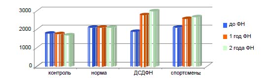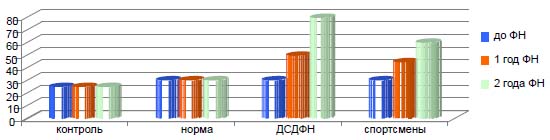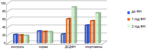 Рис. 1. Гистограмма изменений УФФР за 2 года учебных занятий у студентов и тренировочных нагрузок у студентов-спортсменов.