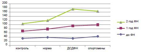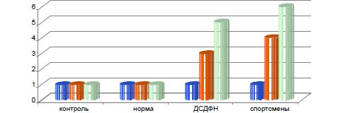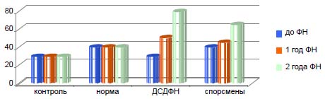 Рис.8. Сгибание-разгибание рук в упоре лежа (отжимания). Слева направо: контроль, потом норма, ДСДФН, спортсмены.