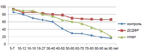 Рис. 4. Возрастные изменения количества "живых" ядер буккального эпителия (биотест Шахбазова В.Г.). Квадратики - контроль; спортсмены - треугольники; ДСДФН - прямоугольники.