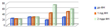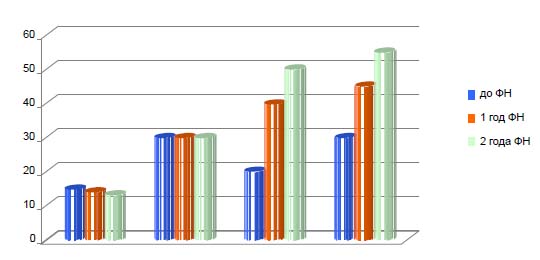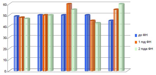 Рис. 2. Тест Руфье после 2-х лет учебных и тренировочных занятий. Слева направо: до ФН, после 1 года ФН и после " лет ФН.