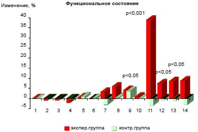 Рис. 1. Изменение показателей функционального состояния студенток контрольной (n=25) и экспериментальной (n=25) групп до и после проведения эксперимента: 1- длина тела, см; 2- масса тела, кг; 3- индекс Кетле, у.е.; 4- ЧССпокоя, уд·мин-1; 5- АДсистолическое, мм рт ст; 6- АДдиастолическое, мм рт ст; 7- проба Штанге, с; 8- проба Генчи, с; 9- ЖЕЛ, дм3; 10- окружность грудной клетки, см; 11- экскурсия грудной клетки, см; 12- индекс Пироговой, у.е.; 13- индекс Гарвардского степ-теста, у.е.; 14- индекс Скобинской, у.е.
