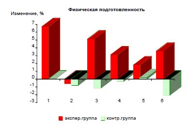 Рис. 2. Изменение показателей физической подготовленности студенток контрольной (n=25) и экспериментальной (n=25) групп до и после проведения эксперимента: 1- плавание (по Куперу), м; 2- бег 30 м, с; 3- тест на гибкость, см.; 4- сгибание-разгибание рук в упоре лежа, кол-во раз; 5- поднимание туловища из положения лежа в положение сидя, кол-раз за 1 мин; 6- высота прыжка вверх с места, см Показатели физической подготовленности девушек контрольной (n=25) и экспериментальной (n=25) групп после проведения эксперимента