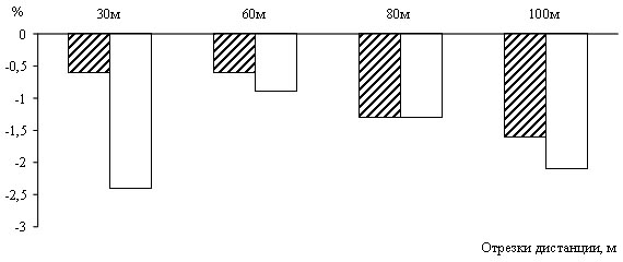 Рис. 1. Изменение времени бега (в %) 100 м и отрезков дистанции между первым (без применения ССРВ 4) и вторым (с применением части комплекса), первым и третьим (с применением полного комплекса) забегами (n=7, МС).