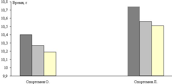 Анализ скорости восстановления ЧСС показал у спортсменов такую же степень изменения напряженности нагрузки, которая типична для общих групповых значений. У спортсмена О. уровень ЧСС на 3 мин восстановления после первого забега 110 уд.мин-1. Сразу после забегов уровень был соответственно 150, 160, 165 уд.мин-1 после третьего забега. У спортсмена Л. уровень ЧСС на 3 мин восстановления был сходным - 110 уд.мин-1. А после каждого забега был соответственно 145, 150, 160 уд.мин -1. На рис. 2. показано время преодоления дистанции 100м спортсмена О-го, который показал наиболее высокий результат и спортсмена Л-ва, который по своим показателям приближался к среднестатистическому результату. На рисунке видно, что при различиях времени преодоления дистанции у обоих спортсменов отмечена положительная динамика спортивного результата. Важно отметить, что у спортсмена О-го (третий результат был выше норматива мастера спорта международного класса -10,27) под воздействием комплекса внетренировочных воздействий результат улучшился с 10,40с до 10,19с. Приведенные данные свидетельствуют о принципиальной возможности использования анализируемого комплекса направленных стимулирующих воздействий для повышения эффективности соревновательной деятельности спринтеров. Это дает основания для использования данного типа воздействий в условиях соревновательных стартов в спринтерском беге. Внетренировочные средства имеющие такие эффекты могут быть использованы как в условиях соревновательной деятельности, так и в процессе тренировки в тех видах спорта, которые связаны с проявлением спринтерских способностей спортсменов. Таким образом, специальный комплекс внетренировочных средств оказывает стимулирующий эффектна некоторые проявления специальной выносливости легкоатлетов-спринтеров. Приведенные данные показали принципиальную возможность использования специальных упражнений, направленных на стимуляцию работоспособности и восстановления спортсменов для компенсации специфического утомления спортсменов, развивающегося при повторениях спринтерской работы (то есть, в условиях "повторного спринта"). Материалы, представленные в работе включают результаты экспериментальной проверки возможностей использования внетренировочных средств в условиях, моделирующих соревнования в спринтерском беге. Известно, что положительный адаптационный эффект спринтерской тренировки (повторного бега на отрезках дистанции) заметно снижается из-за низкой естественной стимуляции анаболизма в период восстановления. Он в определенной мере может быть интенсифицирован внетренировочными средствами специальной восстановительной направленности. Поэтому стимуляции работоспособности в этих условиях способствует как специфическая стимуляция перед выполнением спринта, так и восстановительные воздействия. Одними из наиболее эффективных такого типа средств являются средства стимуляции вегетативных центров функций системы энергообеспечения работы [4,6]. Внетренировочные средства, применяемые с такой целью рассматриваются нами как средства воздействия, дополнительные к тренировочным и неразрывно с ними связанные. Они применяются для повышения эффективности процесса подготовки спортсменов и для более полной реализации потенциала специальной работоспособности в соревнова