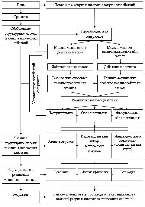 Рис.1. Процесс моделирования соревновательной деятельности в игровых видах спорта. В учебно-тренировочном процессе, когда имеются две модели (атакующая и защитная), создание ситуаций противодействий соперников для повышения результативности атакующих действий осуществляется при помощи соединения обеих моделей в единую направленную систему программирования игровой деятельности. Данная система имеет разный характер, в зависимости от направленности моделей, и позволяет моделировать индивидуальные и групповые противодействия защитников и нападающих: - наступательный (с преобладанием атакующей модели над защитной). В данном случае нападающие игроки осваивают возможные ситуации обыгрывания защитников, разнообразие которых побуждает нападающих к поиску все новых способов атаки; - оборонительный (с преобладанием защитной модели над атакующей). В результате нападающие игроки осваивают, наряду с особенностями защитных действий соперников, приемы и способы, не позволяющие осуществить отбор, перехват мяча, шайбы и накрывание бросков в процессе атаки; - наступательно-оборонительный (без преобладания одной из моделей над другой). В процессе моделирования деятельности соперников, нападающему и защитнику предлагается действовать на основе творческого, индивидуального восприятия игровых ситуаций. При переносе модели в учебно-тренировочный процесс тренер имеет широкие возможности самостоятельного манипулирования всем комплексом технико-тактических действий, исходя из целесообразности его применения в условиях атаки. Однако для того, чтобы процесс моделирования начал функционировать, разработанные модели необходимо перенести в игровые условия противодействий соперников. В их составе имеются: дистанция броска; расстояние между защитником и нападающим; временной отрезок игры; характер действий в защите и нападении. При этом возможным представляется моделирование противодействий соперников в условиях фола (экстремальные моменты игры), которые определяются характером действий игроков в нападении и защите. Выводы. Моделирование противодействий соперников является одним из системных методов, который позволяет перенести модели противостояния спортсменов в условия тренировочного процесса с сохранением особенностей, присущим соревновательной деятельности. В результате применения методики направленного повышения результативности атакующих действий на основе моделирования противодействий соперников установлен прирост показателей психических качеств баскетболистов 15-17 лет: объема внимания (18%, Р<0,05), быстроты и точности оперативного мышления (21%, Р<0,05), реакции на движущийся объект с ускорением движения (28%, Р<0,05). Отмечено повышение показателей скоростно-силовых качеств (15%, Р<0,05). Повысилась результативность бросков мяча без сопротивления защитника (47%, Р<0,05), результативность бросков с сопротивлением защитника (60%, Р<0,05). Эффективность применения метода моделирования противодействий соперников подтверждается результатами экспериментальных исследований, которые свидетельствуют о повышении результативности атакующих действий баскетболистов 15-17 лет в условиях соревнований: на расстоянии между нападающим и защитником до 1-го метра на всех дистанциях атаки (Р<0,05); при бросках мяча боком одной рукой "крюком", "по