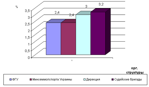 Рис. 1. Классификация функций спортивных соревнований в гандболе Анализ специальной литературы по вопросам проведения спортивных соревнований свидетельствует, что современная управленческая деятельность по осуществлению данного вида мероприятия предполагает следующие этапы: подготовительный; технолого-оперативный и заключительный[2, 3, 6]. Подготовительный этап предусматривает разработку проекта, определяющего основные направления и дифференцирующего отдельные виды работ, процедуры, операции совокупной целевой деятельности по организации соревнований. Для более успешного ее осуществления В.И. Жолдак, С.Г. Сейранов (2006) предлагают использование технологии Системы Технико-Организационного Проектирования Комплексной Акции. Следующий этап - технико-оперативный, включает создание и обеспечение функционирования организационной структуры управления соревнованием. Важной частью проведения спортивных соревнований является заключительный этап в виде церемонии награждения победителей и заседания главной судейской коллегии вместе с представителями команд-участниц по утверждению его результатов. Согласно анализу регламентирующих документов организации и проведения чемпионата Украины по гандболу среди мужских команд сезона 2009/2010 его проводят по круговой системе. Команды Суперлиги проводят игры в два этапа по два круга с разъездами по одной игре (дома и на выезде). Команда, занявшая последнее место в Суперлиге чемпионата Украины по гандболу, по завершении сезона переходит в Высшую лигу. Гандбольный клуб, команда которого заняла первое место в Первой лиге по итогам сезона, переходит в Высшую лигу. Команды Высшей и Первой лиг обязаны играть первые 15 мин.1-го тайма систему активной защиты. Команды Суперлиги участвуют для того, чтобы иметь право на участие в турнирах еврокубков [8]. Результаты собственного социологического опроса позволили установить, что деятельность судейских бригад и дирекции чемпионата среди его участников оценивается как удовлетворительная (рис. 2). Менее эффективной признана деятельность Федерации гандбола Украины и Министерства Украины по делам семьи, молодежи и спорта (2,4 балла из 5 возможных). Также нами установлено, что применение организаторами чемпионата Украины по гандболу среди мужских команд сезона 2009-2010 не эффективных методов и технологий управления, отсутствие научного подхода к его организации повлекло за собой игнорирование ими необходимости устранения организационных недостатков, выявленных при проведении прошлых сезонов. Рис.2. Экспертная оценка эффективности деятельности организационных структур проведения чемпионата Украины по гандболу среди мужчин сезона 2009/2010 В ходе проведения собственных исследований нами было установлено, что для дирекции чемпионата Украины по гандболу среди мужских команд сезона 2009-2010 особое значение при его подготовке имеет деятельность, направленная на формирование его ресурсного обеспечения (4,0 балла) (табл.1). Рассмотрение значения каждого конкретного вида обеспечения позволило установить, что наиболее актуальными для нее являются: формирование финансового обеспечения (4,8 балла), разработка и принятие регламентирующих документов (4,5 балла), взаимодействие с государственными органами руководства развитием физкультурного движения в стран