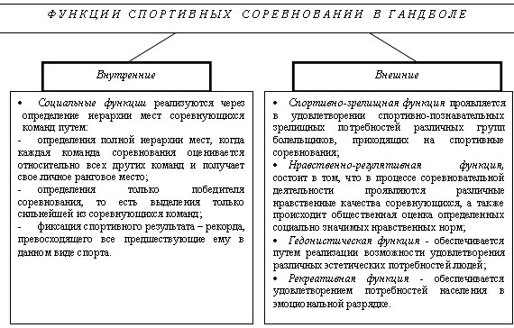 Результаты исследований. В ходе исследования нами установлено, что ведущие теоретики спорта считают, что развитиевида спорта неразрывно связано с количеством и качеством проведения спортивных соревнований. Данное утверждение находит свое подтверждение и в результатах социологического опроса организаторов, судей и участников чемпионата Украины по гандболу среди мужских команд, которые единодушно высказались за целесообразность его проведения. С позиции управления, по мнению В.И.Жолдак, С.Г. Сейранова (2006), И.И. Переверзина (2004), спортивное соревнование следует рассматривать как один из видов педагогически организованной состязательной деятельности, которая включает в себя следующие элементы: предмет состязаний; судейство; спортсменов-участников соревнований; болельщиков и зрителей. В ходе теоретических исследований нами было установлено, что особое значение при организации и проведении спортивных соревнований играют их функции [4, 6, 7]. Авторы отмечают, что спортивные соревнования в новых социально-экономических условиях развития физкультурного движения выполняют два вида функций - внутренние и внешние (рис.1). К числу внутренних функций исследователи относят социальные функции спортивного соревнования. В числе внешних исследователи рассматривают: спортивно-зрелищную, нравственно-регулятивную, гедонистическую и рекреативную функции. Ретроспективный анализ специальных литературных источников и результаты собственных социологических исследований позволили нам определить, что средствами организационно-педагогической регламентации спортивных соревнований, в том числе чемпионата Украины по гандболу среди мужских команд сезона 2009-2010, являются правила спортивных соревнований, Единый календарный план физкультурно-оздоровительных и спортивных мероприятий (календарный план спортивных соревнований), положение о спортивном соревновании, регламент спортивных федераций, сценарий и смета на проведение спортивного соревнования. Наиболее значимыми из них респонденты считают: положение о проведении чемпионата (отметило 30% опрошенных), правила гандбола (20%) и календарь соревнований (10%). Никто из опрошенных специалистов по гандболу не отметил регламент проведения чемпионата, смету и сценарий его проведения. Тогда как именно эти документы рассматриваются исследователями как основные при организации и проведении спортивных соревнований.