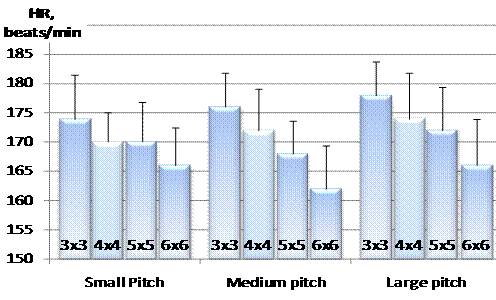 FACTORS INFLUENCING CARDIOVASCULAR RESPONSES DURING SMALL-SIDED SOCCER GAMES PERFORMED WITH RECREATIONAL PURPOSES Bondarev D.V. Sevastopol National Technical University . The aim of this study was to examine the influence of players’ number and pitch size on the heart rate responses during small-sided games of university students who engage in recreational activity. Main effect was found for players’ number and pitch size. Mean HR was significantly higher in 3x3 game than in 4x4, 5x5, 6x6 (p < 0,05). The influence of pitch size factor was significant when number of players were less to four (з2=0,323, p < 0,017). The results demonstrate that the number of players is a more influential factor than pitch size itself. In this regard, the dose-responses criteria should be considered for prescribing small-sided games as a mean for enhancing cardiovascular fitness. Key words: soccer, exercise, intensity, heart rate. Аннотация. Бондарев Д.В. Факторы, влияющие на реакцию сердечнососудистой системы при играх в футбол рекреационной направленности на уменьшенных полях. Целью исследования было определить, как влияет количество игроков и размер поля на ЧСС студентов при игре в футбол. Средняя ЧСС была выше в игре 3х3 по сравнению с играми 4х4, 5х5, 6х6 (p < 0,05). Влияние фактора "размер поля" было значимым при количестве игроков меньше 4 (з2=0,323, p < 0,017). Результаты показывают, что фактор "число игроков" значительней влияет на ЧСС, чем фактор "размер поля". Поэтому применяя игры в футбол на уменьшенном поле для повышения физической подготовленности необходимо учитывать дозировку нагрузки с учетом влияния вышеперечисленных факторов. Ключевые слова: футбол, упражнения, интенсивность, ЧСС. Анотацiя . Бондарев Д.В. Фактори, що впливають на реакцiю серцево-судинноi системи пiд час iгор в футбол рекреацiйноi спрямованостi на зменшених полях. Метою дослiдження було визначення як впливае кiлькiсть гравцiв i розмiр поля на ЧСС студентiв пiд час гри у футбол. Середня ЧСС була вище у грi 3х3 у порiвняннi з грою 4х4, 5х5, 6х6 (p < 0,05). Вплив фактора "розмiр полю" був суттевiй якщо кiлькiсть гравцiв дорiвнювала 4 (з2=0,323, p < 0,017). Результати свiдчать, що фактор "кiлькiсть гравцiв" значнiше впливае на ЧСС, нiж фактор "розмiр поля". Тому пiд час застосування iгор у футбол на зменшеному полi для пiдвищення фiзичноi пiдготовленостi необхiдно враховувати дозування навантаження з урахуванням впливу зазначених вище факторiв.Ключовi слова: футбол, вправи, iнтенсивнiсть, ЧСС. Introduction. Soccer as a recreational activity is widespread among a diverse group of populations. Soccer related activities are used in physical education curricula amongst all ages, as a training practice in a wide range of sports in order to develop fitness conditioning, as well as tactical and technical abilities for participants. So-called recreational soccer is usually carried out as small-sided games. Small-sided games (SSG) are any games played with less than eleven member teams and on a smaller sized field. SSG seem to be a popular alternative to the repetitious exercise modes traditionally employed for the improvement of cardiovascular fitness [3]. For instance, [2, 8] states that using SSG participation as a regular physical activity improves conditioning among students and older adults, and is maintained more successfully. Such popularity of small-sided games can be explained by the facts that they lead to improved physical response, increased individual involvement, heightened levels of enjoyment and perceived competence. For example, during the last decade there have been several studies that have shown that small-sided soccer games can be characterized as having a high aerobic component with mean heart rates of 90 - 95% of maximum heart rate, which is similar to values observed for elite football players during competition matches [4, 11]. In [5] noted that the presence of the ball during small-sided games allows participants to improve physical fitness as well as technical and tactical skills. Several factors influence the intensity of small-sided games such as the number of players, pitch size, coach encouragement, rules of the game and inclusion of goalkeepers. For example, in papers [9, 10] it was established that the smaller number of players, the higher exercise intensity and the more ball contacts amongst all soccer players. Dellal et al. [4] and Rampinini et al. [11] showed that small-sided games are equally effective as interval running in enhancing aerobic fitness in soccer players. Unlike interval running during which intensity can be accurately manipulated through running speed and duration, the intensity of small-sided game is difficult to control. This is also important in recreational soccer. During small-sided games, it is difficult to ac