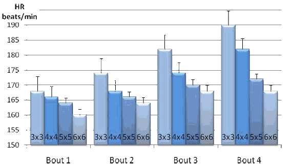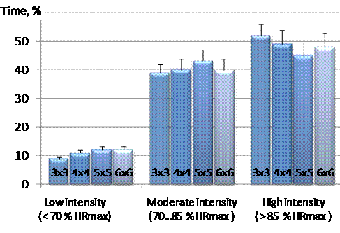 Figure 3. Time spent exercising in different heart rate intensities Discussion. The aim of this investigation was to examine the influence of players’ number and pitch size on HR during recreational small-sided soccer games, also performing in bouts. The results of the present study show that soccer small-sided games could be suitable methods for enhancing cardiovascular fitness in participants who engage in recreational activity. The intensity of small-sided games performed by university students varies from 82 to 88 % HRmax. Moreover, students played with intercity less than 70 % HRmax approximately 10 % of total game time. The ACSM have reported that minimum intensity level suggested for cardiovascular fitness is 55-65 % HRmax [1] Our results show that players’ number involved in a game have a significant influence on training intensity. This result are in line with reports of [3, 5, 9] carried out with professional soccer players or youth players who are training to be professional. The 3x3 game displayed higher exercise intensity compared with the 4x4, 5x5 and 6x6 game. The possible explanation of this is that the less number of players, the more ball contacts for all players [6, 10], and when players touched and dribbled the ball more often during the game they expend more energy [12]. However, our study does not touch movement actions with a ball mostly due to the recreational purposes of soccer where technical and tactical skills are not the main aim of training. In addition to confirm existing reports we demonstrate that in recreational soccer factor "players’ number" has an influence when the number of players is equal to or less than four players. The intensity of 5x5 and 6x6 game format displayed equal values. This is important for recreational soccer, as it helps to quantify the work load in order not to create more powerful stimulus that could lead to overtraining. The influence of pitch size on intensity of small-sided games has been reported in papers Kelly et al., Owen et al, Rampinini et al [7, 10, 11]. For example, E. Rampinini [11] reported that exercise intensity of a 3x3 game on a small pitch was similar to that of a 4x4 game on a larger pitch. Our findings are in line with previous reports. However, present study shows that pitch size are not the main factor that influences HR. Similar results were reported by [7] comparing pitch size in isolation which suggested that the pitch size factor influences HR in combination with other factors. Our results confirm this suggestion and show that factor "pitch size" has a significant effect only with factor "players’ number". When players’ number is more than four the factor "pitch size" does not affect HR substantially. One of the possible explanations can be that in previous studies elite soccer players were examined, where pitch size influences the quality of technical action with the ball (tackles, shots). However, in recreational soccer this influence may be not the same. This suggests that pitch size should be considered when special skill development is required because in recreational soccer the pitch size is not varied usually. Heart rate responses showed variability across four bouts performed and number of players involved. The HR gradually increases from the first bout to the fourth bout. The initial phase of performing the game associated with no differences between game formats while the following bouts displayed greater differences. In a 3x3 game at the 4-th bout the mean HR reached 190 ± 4 beats min-1. This could indicate that additional bouts would not be reasonable for students in recreational purposes. At the same time in a 5x5 and 6x6 games HR response at the 4-th bout reached a plateau on a level suitable for an aerobic training. Therefore, the results of the present study have an important practical implication. They suggest that performing small-sided games in bouts is suitable to achieve required exercise intensity. Conclusions. The conclusion of this study is that small-sided soccer games are suitable means of enhancing cardiovascular fitness for the general population. The intensity of these games has been shown higher than minimum intensity level recommended by ACSM for cardiovascular fitness improvements. For recreational soccer small-sided games the pitch size is not the main factor which affects the training load. The number of players is a more influential factor. Performing small-sided games in bouts is suitable to achieve required exercise intensity in recreational population. In this regard, the dose-responses criteria should be considered for prescribing small-sided games as a mean for enhancing cardiovascular fitness. Studies that compare players’ perception of effort during small-sided games with actual training load would be of great interest in order to monitor the actual level of training stimulus in a diversified exercise as soccer small-sided games. Bibliographic references: 1. American College of Sports Medicine Position Stand. The recommended quantity and quality of exercise for developing and maintaining cardiorespiratory and muscular fitness, and flexibility in healthy adults // Med. Sci. Sports Exerc. - 1998. - № 30 (6). - Р. 975-991. 2. Bondarev D. Heart rate responses during recreational small-sided soccer games: effect of players’ number and pitch size / D. Bondarev // Scientific Report Series Physical Education and Sport. - University of Pitesti, 2010. - № 14. - P.56 - 59. 3. Cardiovascular responses during recreational 5-a-side indoor-soccer / F. Impellizzeri, C. Castagna, R. Belardinelli, and other // Journal of Science and Medicine in Sport. - 2006. - Vol. 10, № 2. - Р. 89 - 95. 4. Heart rate responses during small-sided games and short intemittent running training in elite soccer players: a comparative study / Dellal A, Chamari K, Pintus A, et al. // J Strength Cond Res. - 2008. - № 22(5). - Р. 1449 - 1457. 5. Hoff J. Soccer specific aerobic end