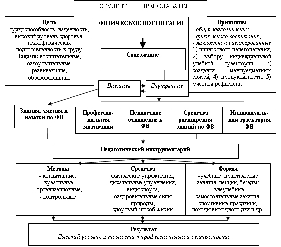 На практике традиционная система физического воспитания была направлена на решение развивающих задач - развитие физических качеств (силы, выносливости и других). Критерием оценки служили государственные тесты, определяющие уровень развития этих качеств. При этом преподаватели не определяли разницу между спортивной тренировкой - формирование физических качеств до максимума и необходимостью их оптимального развития для конкретной профессиональной деятельности, а это является ошибкой. Исследования австралийских учёных [7] доказали, большие напряжения не являются благоприятными для формирования высокого уровня работоспособности на весь период профессиональной деятельности; у человека, который получает большие физические нагрузки, появляются отклонения в состоянии здоровья, которые выявляются в дальнейшей жизни. Таким образом, занятия спортом, а особенно спортом высоких достижений, не только не решают цели физического воспитания, а могут влиять на нее негативно. Профессии различаются по интенсивности, напряженности, количеству физической нагрузки. В подготовке квалифицированных специалистов технического профиля (например, инженеров, системных аналитиков, математиков и других) достаточным условием будет оптимальным средний (не максимальный - не спортивный) уровень развития физических качеств. Также для "малоподвижных" профессий, где отсутствуют профессиональные двигательные навыки, задачу формирования умений и навыков необходимо переосмыслить и сконцентрироваться на формировании умений и навыков рациональной ходьбы, стояния, сидения, повышения работоспособности, рациональной организации работы, организации индивидуальной физической подготовки. Особого внимания требует задача формирования крепкого здоровья, которое является обязательным компонентом успешной профессиональной деятельности и достижения высокой работоспособности, а также надежности в работе. Но, при этом, во время обучения в высшем техническом учебном заведении состояние здоровья студентов ухудшаются (от курса к курсу растет уровень хронических заболеваний). Поэтому необходимо сделать акцент на решении этой задачи. Понимание студентами здоровья в структуре профессионального успеха создают дополнительную мотивацию его формирования. И важно показать влияние самой профессиональной деятельности на состояние здоровья, сформировать стойкость к неблагоприятным условиям работы, воспитывая привычку для выполнения профилактических комплексов. Решение этой задачи даст возможность предупредить профессиональные болезни, создав условия для творческого долголетия. Очень важным является задача формирования мотивации, ценностного отношения к физическому воспитанию и готовности к организации самоподготовки по физическому воспитанию, в нашем исследовании, на решении этой задачи был сделан акцент. Для раскрытия системы физического воспитания необходимо определить принципы, на которых она основывается. Принцип - первооснова, ведущая идея, основное правило. В основе разрабатываемой системы лежат принципы, направленные на создание личностно-ориентированного обучения: личностного целеполагания, выбора индивидуальной учебной траектории, создания меж предметных связей, продуктивности, учебной рефлексии [7, с.48]. Рассматривая сущность с