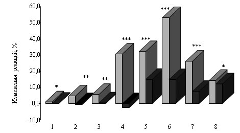 1 - VO2 maх, 2- maх VE, 3 - % excess VE, 4 - Т 50 VE, 5 - Т50 VO2, 6 - время устойчивости VO2, 7 - V'E ПАНО; 8 - V'O2 ПАНО;* - различия показателей контрольной и экспериментальной групп достоверны при р<0,05; ** - различия показателей контрольной и экспериментальной групп достоверны при р<0,01 Увеличение функциональных возможностей танцоров показано по приросту реакций, которые характеризуют различные стороны аэробного потенциала спортсменов. В большей степени эти изменения касались тех сторон аэробных возможностей, которые влияли на работоспособность танцоров в зоне порога анаэробного обмена и в условиях нарастающего утомления в процессе соревновательной деятельности. Результаты исследований свидетельствуют, что развитие компонентов аэробного энергообеспечения - скорости развертывания реакций, подвижности в условиях переменных режимов работы, устойчивости в условиях нарастающего утомления быть фактором совершенствования функциональных возможностей спортсменов. Применение условий реализации нейрогенного, "острого" гипоксического и комплексного нейрогенного и ацидемического стимулов в процессе моделировании режимом упражнений, соответствующей направленности реакций позволяет развивать функции кардиореспираторной системы без активного включения в работу анаэробного гликолитического энергообеспечения, что является требованием совершенствования аэробных возможностей спортсменов. Усиление роли указанных факторов позволит в большей степени сформировать как мобилизационные, так и реализационные компоненты выносливости, применительно к специфическим условиям утомления организма, в процессе соревновательной деятельности спортсменов в спортивных танцах. Выводы.