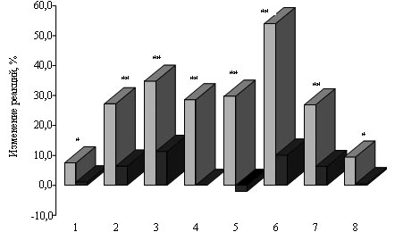 1 - VO2 maх, 2- maх VE, 3 - % excess VE, 4 - Т 50 VE, 5 - Т50 VO2, 6 - время устойчивости VO2, 7 - V'E ПАНО; 8 - V'O2 ПАНО;* - различия показателей контрольной и экспериментальной групп не достоверны; * - различия показателей контрольной и экспериментальной групп достоверны при р<0,05, ** - различия показателей контрольной и экспериментальной групп достоверны при р<0,01