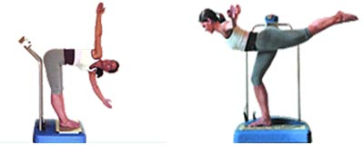 Рис.1. Примеры упражнений, выполняемых на вибрационной платформе. Длительность каждого занятия (40-50 мин), как и содержание упражнений, было одинаковым в обеих группах. Занятия проводились одним и тем же специально подготовленным инструктором в обеих группах. Общая длительность вибрационной нагрузки в процессе одного занятия составляла 8-12 мин. На период исследований женщины не принимали участия в регулярной физической тренировке. Их повседневная двигательная активность определялась стандартными обучающими программами, которые на период исследований не содержали физических нагрузок. Обследуемые женщины были разделены "слепым" методом на две группы. Одна из групп выполняла программу занятий с использованием работающей вибрационной платформы (экспериментальная группа), а другая (контрольная группа) выполняла те же упражнения с использованием не работающей вибрационной платформы. Одновременно использовалось 10 вибрационных платформ. Использовались содержание и режим выполнения упражнений, ориентированных на повышение двигательных возможностей и улучшение общего физического состояния женщин. В процессе занятий выполнялись физические упражнения разностороннего характера: для повышения силы ног и рук, гибкости и общей двигательной координации. Программа занятий включала 24 занятия за 8 недель (то есть, три раза в неделю) и основывалась на базовых принципах построения такого типа оздоровительной тренировки [3,13]. Запланированную программу тренировки в экспериментальной группе с начала до конца выполнили все 20 женщин. В контрольной группе указанная программа тренировки и измерений полностью была выполнена 18 женщинами. При измерении на постурографической платформе анализировались данные 14 и 15 женщин экспериментальной и контрольной групп, соответственно. По комплексу показателей перед началом экспериментальной программы, через четыре и восемь недель ее выполнения проводились следующие измерения в стандартных условиях: 1. Активной и пассивной гибкости в тазобедренных суставах (для левой и правой ноги) (антропометр); 2. Устойчивости равновесия тела по трем тестам, именно, поддержание равновесия тела, стоя на одной ноге с закрытыми глазами; два теста на постурографической платформе - после оборотов вокруг оси тела, а также по устойчивости равновесия стоя с закрытыми глазами (Posturograph platform PL); 3. Точности воспроизведения 50% от максимальной силы (средняя из пяти проб) при работе изокинетического характера большими группами мышц (Dyno 2); 4. Точности воспроизведения пространства во вращении - заданного угла вращения вокруг оси тела (3600) в прыжке при оборотах вокруг оси тела в левую и правую стороны. С целью анализа изменений анализируемых показателей была проведена статистическая обработка данных (Statistica 99). Вычислялись среднее арифметическое, стандартное отклонение, максимальные и минимальные величины. Достоверность различий (при p<0,05) оценивалась тестом t-Studenta. Результаты исследований. Результаты измерений анализируемых показателей пассивной и активной гибкости в тазобедренных суставах под влиянием вибрационной тренировки для всего тела в экспериментальной и контрольной группах представлены в таблицах 2 и 3. Таблица 2 Изменения пассивной гибкости в тазобедренных суставах в течение 8 недель тренировки (Средние, SD)