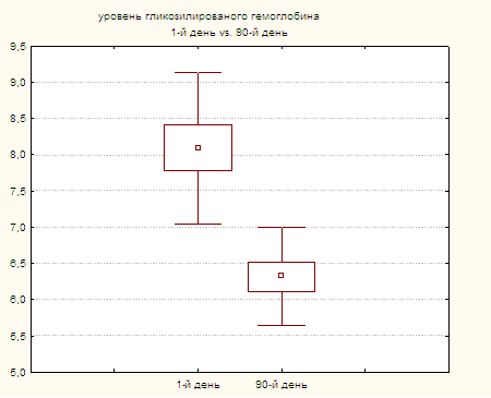 Нами отмечено, что при отсутствии улучшения показателей физической работоспособности не наблюдается явного снижения доз инсулина, что можно проследить по данным коэффициенты корреляции (r = 0,42, r = 0,29, r = 0,46), указывающему на слабую взаимосвязь между показателями дозы инсулина и результатами пробы Руфье у подростков 12 лет контрольной группы. Так как уровень глюкозы в крови широко варьирует, показателем общей эффективности контроля сахара в крови в течение какого-либо периода времени служит показатель гликозилированного гемоглобина (HbAl c).Гликозилированный гемоглобин (HbA1 или HbA1c) - важный параметр, который является усредненным показателем концентрации глюкозы за последние 6-8 недель. HbA1c - образуется в результате взаимодействия гемоглобина с глюкозой крови и накапливается в эритроцитах в течение всего времени их существования (около 120 дней). Снижение уровня гликозилированного гемоглобина среди подростков основной группы 12 летнего возраста на клиническом этапе реабилитации составил 17 % (t = 10,4; р < 0,00001), для группы подростков 13-16 летнего возраста - 16,3 % (t = 11,0; р < 0,00001), для группы подростков 17 летнего возраста - 21,9 % (t = 9,7; р < 0,000002) (рис.3). Рис. 3. Эффективность предложенной программы физической реабилитации по показателям степени снижения уровня гликозилированного гемоглобина среди подростков основной группы 17 летнего возраста на клиническом этапе лечения (распечатка с экрана монитора): - среднее значение,