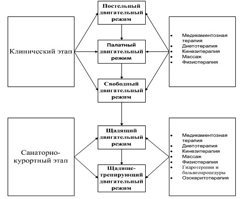 Рис. 1. Блок-схема реабилитационно-профилактических мероприятий на клиническом и санаторно-курортных этапах физической реабилитации Комплексная программа физической реабилитации включала в себя: