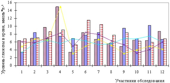 Рис. 2. Показатели уровня гликемии среди подростков основной группы 13-16 летнего возраста на клиническом этапе лечения (n=12),(р<0,05): Установлено, что реакция на физическую нагрузку больных диабетом во многом определяется степенью компенсации диабета и величиной физической нагрузки. В силу индивидуальных особенностей развития и функциональных возможностей организма выполнение пробы Руфье оказалось достаточно трудным для большинства подростков, участвующих в наших исследованиях. Поэтому, высокую работоспособность не продемонстрировал ни один подросток в возрасте 12-17 лет на клиническом этапе лечения. При первом тестировании по результатам пробы Руфье установлено, что работоспособность у 12,3 % подростков с СД I типа хорошая, посредственная - у 43,9 %, удовлетворительная - у 33,3 %,плохая - у 10,5% обследованных. На втором этапе тестирования, после 30 дней ежедневных занятий по предложенной нами программе работоспособность подростков, больных сахарным диабетом, возросла. Так, хорошую оценку физической работоспособности получили 15,8 % подростков, среднюю - 52,6 % подростков, удовлетворительную - 31,6 % подростков. На третьем этапе тестирования, после 60 дней ежедневных занятий физическая работоспособность подростков достоверно продолжала увеличиваться, о чем свидетельствуют результаты пробы Руфье - хорошую оценку получили 33,3 % подростков, среднюю - 50,9 %, удовлетворительную - 15,8 % подростков. Больные с плохой работоспособностью отсутствовали. Следует подчеркнуть, что более низкие среднестатистические показатели пробы Руфье были характерны для подростков с мышечным типом телосложения (при р<0,05). Корреляционный анализ, нами использован для проведения анализа наличия связи между показателями снижения дозы инсулина и результатами пробы Руфье. При тестировании установлена незначительная линейная взаимосвязь между показателями снижения дозы инсулина и результатами пробы Руфье среди подростков основной группы 12 летнего возраста, незначимы в первый день r = 0,44 (при р>0,05), 30-ый день r = 0,75, и высоко значимы 60-ый день r = 0,93 при р<0,05 (табл. 3). Таблица 3 Среднестатистические значения пробы Руфье у обследованного контингента на клиническом этапе лечения (основная и контрольная группы), в баллах, (n=57)