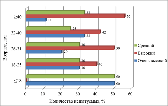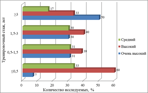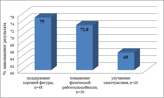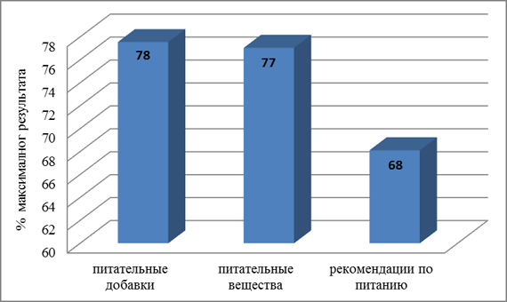 Материал и методы исследований Основным методом исследования явилось анкетирование. Анкета содержала как вопросы общего характера (возраст, тренировочный стаж, главная цель тренировки и источники приобретения знаний), а также 15 вопросов, касающихся питания. Эти вопросы относились к трём направлениям: рекомендации по питанию, пищевые вещества и пищевые добавки. Анкета была построение по принципу однократного выбора (по каждому вопросу только один правильный ответ). Каждый правильный ответ оценивался одним пунктом. Таким образом, исследуемые могли получить максимально 15 пунктов. Для определения уровня знаний были приняты следующие градации: очень высокий - 13-15пунктов, высокий - 10-12, средний - 7-10, низкий - 4-6, очень низкий - 0-3. В исследованиях приняли участие 98 женщин в возрасте 18-50 лет (30,4±9,6), занимающихся фитнесом в трёх фитнес-центрах г. Гданьскаи Сопота. Испытуемые декларировали разные цели своих тренировочных занятий. Для повышения физической работоспособности занимается 30женщин, для поддержания хорошей фигуры - 48 и для хорошего самочувствия - 20. Для достижения своих тренировочных задач занимающиеся используют разные формы тренировок: йога, spining, stape&shape, ABT, TBC, stretching. Однако главной формой занятий являлась аэробика. Результаты исследования Результаты проведенного исследования показали, что исследуемая группа продемонстрировала, в общем, высокий уровень знаний по вопросам, касающихся питания. Средний для группы показатель составил 10,8 пунктов. При этом у 50% испытуемых он оказался высоким, у 26% - очень высокими у 24% - средним. Из трех проблем, касающихся питания, самый высокий уровень значимости представляют вопросы, связанные с использованием пищевых добавок (78% от максимального количества правильных ответов), самый низкий - по рекомендациям, относящимся к организации рационального питания - рис.1. Рис. 1. Уровень знаний по проблемам питания у женщин, занимающихся рекреационным фитнесом (n=98, % от максимального результата) Выявлены различия в уровне знаний женщин по вопросам питания в зависти от задачи тренировочного процесса (рис.2). Самый высокий уровень знаний проявили женщины, которые тренируются для "красоты" (поддержания хорошей фигуры). Рис. 2. Уровень знаний по вопросам питания у женщин, занимающихся рекреационным фитнесом, в зависимости от направленности тренировочных занятий (% от максимального результата) Распределение уровней знаний в зависимости от возраста занимающихся указывает на определённую неоднородность результатов (рис.3). В группе до восемнадцатилетнего возраста половина исследуемых женщин демонстрирует очень высокий уровень знаний. Однако если принять во внимание только очень высокий и высокий уровни знаний, то самое большое их количество отмечено в группе 32-40 летних женщин (75%), а самое малое - в группе до 18 лет (50%). Рис. 3. Соотношение уровней знаний по вопросам питания у женщин, занимающихся рекреационным фитнесом, в зависимости от возраста, % Тренировочный стаж существенно влияет на распределение уровней знаний по вопросам питания (рис. 4). В группе тренирующихся свыше трех лет половина исследуемых женщин проявила очень высокий уровень знаний. Если учесть только очень высокий и высокий уровни знаний, то эта группа также оказалась наиболее репрезентативной (88%). Самый низкий результат обнаружен в группе