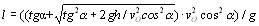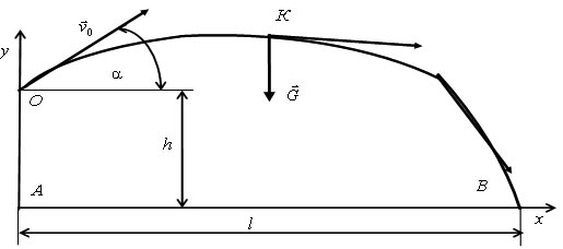 Рис. 4. Расчетная схема для определения абсолютной начальной скорости вылета, угла вылета, высоты выпуска копья Интегрируя дифференциальные уравнения движения копья, получим: Получим графические зависимости значений дальности полета копья l: - от абсолютной начальной скорости вылета копья при принятом значении угла вылета и высоты выпуска копья (рис. 5); - от угла вылета при принятом значении абсолютной начальной скорости вылета копья и высоты выпуска копья (рис. 6); - от высоты выпуска копья при принятом значении абсолютной начальной скорости вылета копья и угла вылета (рис. 7). Рис. 5. Графическая зависимость значений дальности полета копья от абсолютной начальной скорости вылета копья Рис. 6. Графическая зависимость значений дальности полета копья от угла вылета Рис. 7. Графическая зависимость значений дальности полета копья от высоты выпуска копья Таким образом, используя аналитические выражения для определения дальности полета копья в зависимости от скорости вылета, угла и высоты вылета, построены графические характеристики, которые позволяют учитывать возможности спортсменов в достижении лучшего результата. Выводы Спортивный результат в метании копья (дальность полета) определяются в основном биомеханическими характеристиками, которые способен реализовать спортсмен, а именно: абсолютной начальной скоростью вылета, углом вылета, высотой выпуска копья. В спортивной практике рекомендуется использовать полученные графические зависимости значений абсолютной начальной скорости вылета копья от переносной скорости разбега. Также рекомендуется использовать графические зависимости значений дальности полета копья: - от абсолютной начальной скорости вылета копья при принятом значении угла вылета и высоты выпуска копья; - от угла вылета при принятом значении абсолютной начальной скорости вылета копья и высоты выпуска копья; - от высоты выпуска копья при принятом значении абсолютной начальной скорости вылета копья и угла вылета. Дальнейшие исследования планируется направить на изучение биомеханических особенностей взаимодействия системы "спортсмен-спортивный снаряд" в других видах спорта. Список литературы 1. Аванесов В.У. Применение специального кистевого отягощения в процессе выполнения бросковой работы легкоатлетами-метателями / Аванесов В.У., Ефремова В.И. // Моделирование спортивной деятельности в искусственно созданной среде (стенды, тренажеры, имитаторы) : (материалы конф.). - М.: 1999. - С. 4-5. 2. Адашевский В.М. Основные кинематические характеристики ударных действий в таэквондо = Basic kinematics descriptions of shock actions in taekwondo / Адашевский В.М., Ермаков С.С., Грицюк С.А. // Физическое воспитание студентов. - 2010. - N 4. - С. 3-5. 3. Адашевский В.М. Биомеханические аспекты технико-тактических действий в дзюдо / Адашевский В.М., Дулевски Михал, Ермаков С.С. // Педагогiка, психологiя та медико-бiологiчнi проблеми фiзичного виховання i спорту: науковий журнал. - Харкiв, ХОВНОКУ-ХДАДМ, 2011. - №3. - С. 3-7. 4. Адашевский В.М. Теоретические основы механики биосистем: Учебное пособие/ В. М. Адашевский. - Харьков НТУ "ХПИ", 2001. - 258 с. 5. Александров А.В. Биомеханическая модель тела человека для описания многосуставных движений в трехмерном пространстве / А.В. Александров, А.А. Фролов // Биомеханика-2006 : 8 Всерос. конф. по биомеханике, Н. Новгород, 22-26 мая 2006 г. : тез. докл. / Рос. акад. 