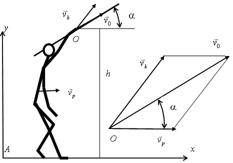 Рис. 1. Расчетная схема для определения абсолютной скорости вылета Здесь v0 - абсолютная начальная скорость вылета копья, vр - переносная скорость разбега тела, vк - относительная скорость кисти руки с копьем. Следует заметить, что максимальная относительная скорость кисти с копьем рассчитывается или графоаналитическим или аналитическим методами с учетом взаимного положения сегментов верхней конечности. В проекциях на оси декартовой абсолютной системы координат (XAY) это равенство имеет вид: