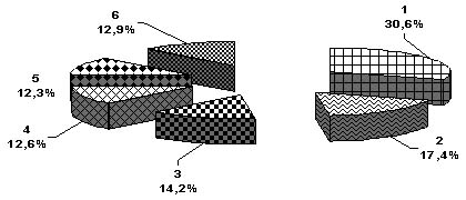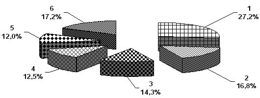 Очевидно, что такие личностные характеристики баскетболистов, как мышление вербально-логическое, уровень интеллектуального развития, личностная тревожность, целеустремленность, решительность, смелость, скорость переработки информации в зрительно-двигательной системе, эффективность и точность работы на внимание, физическая агрессивность составляют показатели, которые возможно использовать для определения перспективных среди спортсменов (табл. 1). Обработка фактического материала методом факторного анализа позволила выявить структуру показателей личностных особенностей и видов подготовленности юных баскетболистов 10, 11 и 12 лет. По окончанию обучения на этапе начальной подготовки у баскетболистов, в возрасте 12 лет, определены факторы, вклад которых составил 87,1%. Сюда нами включены: 1-й фактор - когнитивно-волевые проявления спортсменов - 30,6 %; 2й - лидерство - 17,4%; 3-й - волевые проявления - 14,2%; 4-й - коммуникативность - 12,6%; 5-й - обучение и воспитание-12,3%; 6 - й - другие особенности-12,9 %. На наш взгляд, необходимо отметить постоянство формирующих факторов в структуре как в 10, так и в 11 и 12 лет, а также наличие во всех возрастных группах ярко выраженного ведущего фактора - "когнитивно-волевые проявления в игре", который имеет тенденцию к увеличению своего вклада относительно остальных факторов. При этом увеличение происходит за счет уменьшения вклада в общую дисперсию шестого фактора. Это позволило нам осуществить анализ данных, характеризующих факторы и показатели их составляющие у баскетболистов по окончанию обучения, на этапе начальной подготовки, в возрасте 12 лет. Так, первой фактор здесь имеет вклад 30,6 % и формируется посредством уровня игровой, технической и физической подготовленности, оперативного мышления, уровня интеллектуального развития, эффективности работы на внимание, скорости переработки информации в зрительно-двигательной системе, что позволяет говорить об активном использовании когнитивных функций спортсмена. В сочетании с целеустремленностью, решительностью, смелостью и физической агрессивностью, перечисленные показатели позволяют характеризовать этот комплекс, как "когнитивно-волевые проявления в игре". Во втором факторе физическая агрессивность и личностная тревожность, в сочетании с экстровертированностью и спонтанностью формируют лидерские качества у спортсменов, поэтому такое сочетание показателей названо нами "лидерство". Необходимо отметить, что, по нашему мнению, сочетание проявления юным баскетболистом свойств экстраверсии и спонтанности формируют лидерский тип спортсмена, а не ведомый. Для баскетболиста, проявляющего спонтанность, характерна позитивная самооценка и стремление к нормальному самоутверждению. При более высоких показателях проявления спонтанности у спортсмена наблюдается раскованность поведения и стремление к лидерству. Спонтанность характеризует личность баскетболиста, как двигательно-активную, а экстравертированность, - как социально-активную. Эти характеристики наиболее точно соответствуют требованиям и "духу" игры в баскетбол. Теоретическое обоснование значений показателей во втором факторе позволяет определить его, как "фактор лидерства". Содержание 3-его фактора (14,2%) у 12 летних спортсменов характеризуется наличием волевых качеств - настойчивости, смелости 