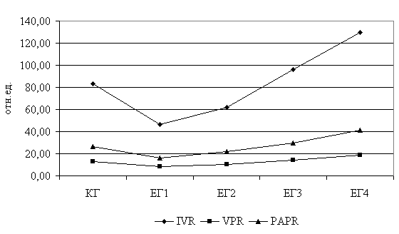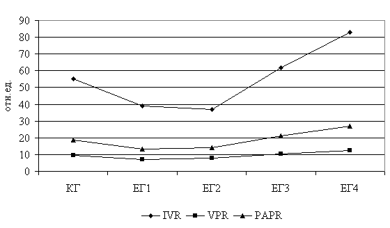Рис. 2. Особенности изменений индекса вегетативного равновесия, вегетативного показателя ритма, показателя адекватности процессов регуляции во время восстановления у студентов с разным уровнем физической работоспособности (а - юноши, б - девушки). По сравнению с КГ VPR у юношей был ниже в ЕГ 1 на 25,6 % (Р<0,001), в ЕГ 2 - 16,8 % (Р<0,001), а в ЕГ 4 превышал показатель контроля на 30,1 % (Р<0,001). У девушек ЕГ 1 VPR был ниже на 34,6 % (Р<0,001), ЕГ 2 - 21,9 % (Р<0,001), а в ЕГ 4 - был выше на 43,5 % (Р<0,001), чем в КГ. IVR у юношей ЕГ 1 был ниже на 29,1 % (Р<0,001), в ЕГ 2 на 72,8 % (Р<0,001) чем в КГ, а в ЕГ 4 превышал указанный показатель на 50,9 % (Р<0,001). У девушек в период восстановления ЕГ 1 и ЕГ 2 исследуемый показатель снижался в сравнении с КГ на 43,9 % (Р<0,001) и 25,5 % (Р<0,001), а в ЕГ 4 превышал значение КГ на 55,6 % (Р<0,001). Доказано, что одним из показателей здоровья есть адаптационные возможности организма [1]. Для того, чтобы при новых условиях сохранить существующий уровень функционирования или перейти на более адекватный, необходимо определенное напряжение регуляторных механизмов, направленное на мобилизацию функциональных резервов. Именно степень напряжения регуляторных систем определяет определено функциональное состояние человека с точки зрения эффективности приспособления организма к новым условиям. Установлено, что сердечно-сосудистая система является чувствительным индикатором адаптационных реакций организма, что позволяет обнаружить долю различных уровней и систем регуляции [2, 4]. Физические нагрузки являются адекватным механизмом, активирующим регуляторные системы организма и позволяют оценить функциональное состояние человека. Наши исследования показали, что общая мощность спектра сердечного ритма после велоергометрической нагрузки является наибольшей в группе с "высоким уровнем" физической работоспособности, что свидетельствует о наличии значительных резервов регуляции. Со снижением уровня физической работоспособности значение указанного показателя снижается. Это сопровождается повышением SI, IVR, VPR, PAPR, что отображает повышение напряжения регуляторных систем. Следует отметить, что у юношей с высоким и выше среднего уровнем физической работоспособности значения SI существенно не отличалось. У девушек со снижением HRV TI и IС снижается уровень физической работоспособности. Обратная динамика наблюдается со стороны соотношения LF/HF. У юношей максимальные значения HRV TI, IС и соотношения LF/HF были зарегистрированы в группе физической работоспособности выше среднего уровня. Возможно, что низкие величины этих показателей в группе с высоким уровнем физической работоспособности обусловлены экономизацией функций организма. Таблица 1 Особенности динамики стрес-индекса, индекса централизации, триангулярного индекса и соотношения LF/HF во время восстановления у студентов с разным уровнем физической работоспособности