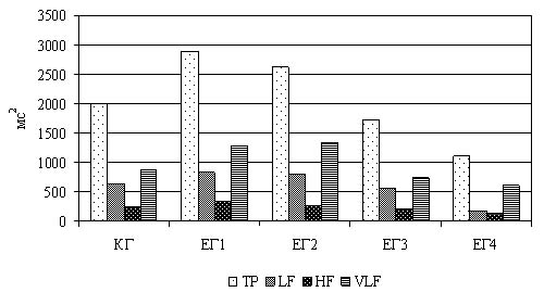 Рис. 1. Особенности спектра сердечного ритма во время восстановления у студентов с разным уровнем физической работоспособности (а - юноши, б - девушки). Следует отметить, что у юношей ЕГ 1 и ЕГ 2 HRV TI превышал показатели КГ на 17,0 % (Р<0,001) и 18,9 % (Р<0,001), а в ЕГ 4 был меньше на 28,9 % (Р<0,001). По отношению к величине в КГ, HRV TI у девушек ЕГ 1 возрос на 57,7 % (Р<0,001), в ЕГ 2 на 16,6 % (Р<0,001), а в ЕГ 4 был меньше на 30,6 % (Р<0,001). В ЕГ 3 достоверных изменений по отношению к КГ в период восстановления не обнаружено. При оценке величины PAPR выяснено, что у юношей ЕГ 1 его значение составляло 72,4 % (Р<0,001), ЕГ 2 - 75,4 % (Р<0,001) от значения КГ, а в ЕГ4 - превышало этот уровень на 45,5 % (Р<0,001). По отношению к значению КГ при этих условиях, PAPR у девушек ЕГ 1 был меньше на 40,0 % (Р<0,001), ЕГ 2 на 17,7 % (Р<0,001), а в ЕГ 3 и ЕГ 4 превышал значение КГ на 12,4 % (Р<0,002) и 55,7 % (Р<0,002) соответственно (рис.2).
