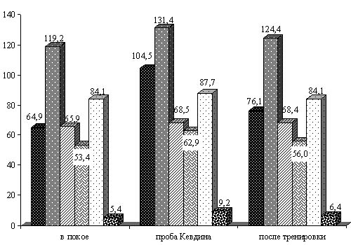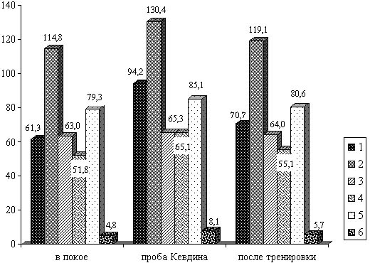 Рис.1. Показатели центральной гемодинамики в баскетболисток контрольной группы (n = 9); 1 - частота сердечных сокращений (ЧСС, уд/мин);2 - систолическое артериальное давление (САД, мм рт.ст.);3 - диастолическое артериальное давление (ДАД, мм рт.ст.);4 - пульсовое артериальное давление (ПАД, мм рт.ст.);5 - систолический объем крови (СО, мл); 6 - минутный объем кровообращения (МОК, л/мин). После тренировочного занятия все показатели деятельности сердечно-сосудистой системы приблизились к исходному уровню. Таким образом, реакцию сердечно-сосудистой системы спортсменок контрольной группы можно считать нормотонической, так как параллельно с повышением ЧСС, при физической нагрузке, в них наблюдалось также увеличение СО и МОК. Такая реакция отражает эффективную адаптацию организма к физической нагрузке и достаточный уровень регуляторных процессов, что способствует увеличению притока крови к работающим мышцам, а вследствие этого и адекватному снабжению кислородом и питательными веществами, а соответственно и удалению продуктов метаболизма.