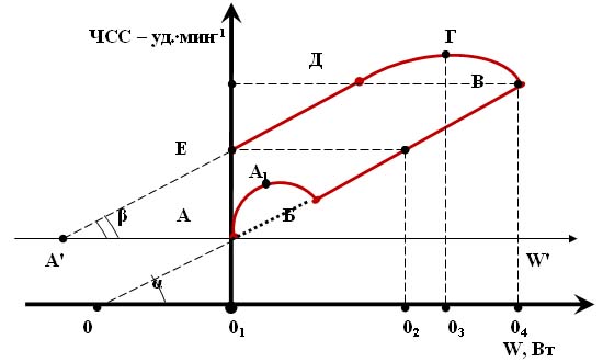 Рис. Схема динамики частоты сердечных сокращений при тестировании Результаты исследования. Проведенные исследования показали, что с успехом можно использовать параметры функциональных возможностей, полученные во время велоэргометрической нагрузки с изменением мощности по замкнутому циклу в процессе занятий по физическому воспитанию в вузах с целью оценивания учебных достижений. Модифицированная методика [1] позволила получить показатели системной реакции организма, как напряженность функций при выполнении нагрузочной пробы, энергетические, регуляторные компоненты сердечной деятельности, а также ряд показателей общей физической работоспособности. После тестирования результаты можно получить в распечатанном виде в течение 5-10 с. Изучена информативность около 25 показателей теста, которые характеризуют функциональные возможности студентов. Соответствующие показатели функциональной пробы играют роль критериев при оценивании учебных достижений, однако их информативность неодинакова: высокая, средняя и низкая. Поэтому мы на основе корреляционно-регрессионного и факторного анализа отобрали наиболее информативные показатели, которые с разных сторон отражают уровень функциональных возможностей. Оценивание проводится при помощи специально разработанных оценочных норм для юношей и девушек возрастом от 18 до 19 лет (табл. 1, 2). В оценочные таблицы вошли следующие показатели: физическая работоспособность - PWC170, и Wрев, пороговый пульс - ЧССпор, частота сердечных сокращений в момент завершения нагрузочного тестирования - ЧССвых, среднеарифметическая величина пульсовых ударов на протяжении функциональной пробы - ЧССср, скорость перераспределения мощности сердечных сокращений (СС) в процессе полного цикла тестирования - S1, время инерции - Тин, коэффициент эффективности регуляции сердечной деятельности - Кэф, уровень внутренней мощности в момент реверса - Wрев, уровень внутренней мощности по завершению тестирования - Wвых, внешняя работа сердечного сокращения при увеличении нагрузки - W1 внеш, внешняя работа сердечного сокращения при уменьшении нагрузки - W2 внеш. Таблица 1 Оценочные нормы функциональных возможностей студентов высших учебных заведений