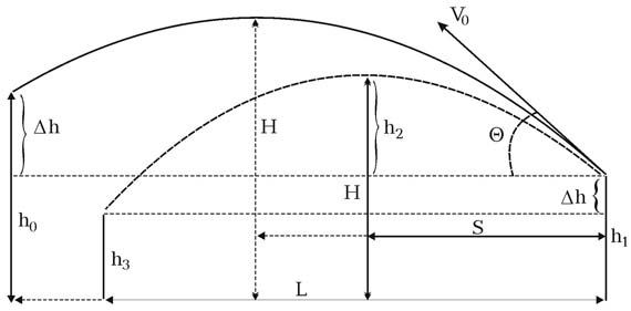 Введение К числу факторов, влияющих на точность длинной передачи мяча в баскетболе, специалисты игры относят траекторию полета мяча [1, 3, 4, 6], считая при этом, что оптимальной следует считать передачу со средней траекторией [2, 8, 9, 10]. Тем не менее, отдельные авторы обосновывают целесообразность выполнения длинной передачи мяча с высокой траекторией [11]. В то же время многие тренеры указывают, что при выполнении длинной передачи с высокой траектории полета мяча возрастает вероятность ее перехвата соперником [4, 8]. Следует отметить, что в литературе по баскетболу не приводятся конкретные рекомендации по углу вылета мяча. Анализ литературы по гандболу, спортивной игре, в которой спортсмены намного чаще баскетболистов пользуются данным элементом техники и с высокой точностью передают мяч в различные зоны площадки, эти сведений также не содержатся [5, 7]. Таким образом, анализ литературы показал, что в доступных нам литературных источниках отсутствуют расчеты параметров траектории длинной передачи мяча и обоснованные рекомендации по выбору оптимальной траектории, как в баскетболе, так и в сопутствующих игровых видах спорта. Исследование выполнялось согласно Сводного плана научно - исследовательской работы Министерства образования и науки, молодежи и спорта Украины на 2011- 2015 г.г. по теме 2.4. "Теоретико-методические основы индивидуализации учебно-тренировочного процесса спортсменов в игровых видах спорта ". Цель, задачи работы, материал и методы. Цель статьи - расчет параметров траектории длинной передачи мяча в баскетболе. Результаты исследования. Путь мяча, который бросает баскетболист при выполнении длинной передачи, можно разделить на две части. Первая включает путь, который описывает мяч, находясь в руках игрока, вторая часть - это полет мяча в воздухе от момента вылета его из рук спортсмена до ловли его партнером по команде. Первая часть - траектория разгона мяча, вторая - траектория его полета. При длинной передаче мяча в баскетболе для каждой точки ее выполнения существует множество траекторий, обеспечивающих попадание мяча в заданную область. Эти траектории отличаются друг от друга углом вылета и соответствующей ему величиной начальной скорости полета мяча. Рис 1. Параметры траектории полета мяча при выполнении длинной передачи На рис. 1 представлены схемы траекторий полета мяча при передаче игроку, ловящему мяч в высоком прыжке на уровне баскетбольной корзины (305 см) и на уровне груди (165 см). Параметры траектории полета мяча при выполнении длинной передачи: дистанция, на которую выполняется передача (L), высота точки вылета мяча (h1), высота точки ловли мяча (h0, h3 ), угол вылета (Q ), начальная скорость вылета (Vo), высота максимальной точки траектории передачи (H) и расстояние от передающего игрока до проекции этой точки на площадку (S). Последние два параметра используются в тренировочном процессе при применении ориентиров, которые помогают игрокам выполнять длинные передачи с различными углами вылета мяча и обеспечить формирование навыка длинной передачи в определенном диапазоне углов его вылета. Для определения места установки ориентира S и его высоты H при выполнении длинной передачи, в которой мяч будет ловиться в прыжке на высоте баскетбольной корзины, воспользуемся известными из механики уравнениями движения тела, бро