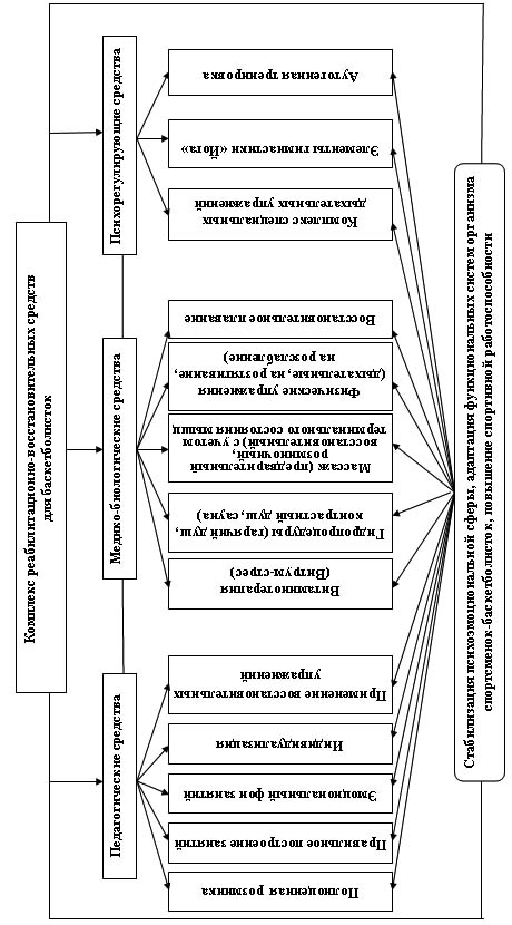 Рис.1. Блок-схема комплексной программы реабилитационно-восстановительных средств для баскетболисток Результаты исследования. По показателям функциональной подготовленности и физической работоспособности спортсменок была обнаружена разная структура активности адаптивных систем организма баскетболисток. И поэтому они были разделены на две группы (контрольную и основную) по индивидуальным особенностям функционирования адаптивных систем по результатам медико-биологического тестирования. Контрольная группа спортсменок оценивалась как группа с адекватной активностью адаптивных систем, к ней мы отнесли 9 баскетболисток. Основная группа, в которую вошли 8 спортсменок оценивалась как группа с напряженностью механизмов адаптации к физической нагрузке и требовала применения реабилитационных мероприятий. В основу программы реабилитационно-восстановительных мероприятий было положено целенаправленное применение сформированных комплексов педагогических, медико-биологических и психологических средств восстановления и повышения спортивной работоспособности (рис.1) в который вошли дыхательные упражнения, элементы гимнастики йога, аутотренинг, различные виды спортивного массажа, гидропроцедуры. Дыхательные упражнения способствовали повышению резервных возможностей дыхательной системы и аэробной производительности организма на начальных этапах адаптации к физическим нагрузкам. Из многочисленных дыхательных упражнений для восстановления баскетболисток были подобраны такие, которые развивают в первую очередь, объемные характеристики внешнего дыхания, гипоксическую устойчивость, влияющие на ЦНС и способствуют ускорению восстановительных процессов. Комплексы асан с гимнастики йога в сочетании с аутотренингом нами были выбраны потому, что они, вызывая изометрическое напряжение, оставляют после себя эффект так называемого постизометрического расслабления, что положительно взаимодействует с релаксирующим эффектом аутогенной тренировки. Продолжительность выполнения комплекса асан составляла 15 минут. Проводился хронометраж занятия, где фиксировалась ЧСС сразу после окончания основной части, после выполнения асан в разных исходных положениях и сеанса аутотренинга. Структура комплексов асан основывалась на: анатомическом строении тела; анатомическом диапазоне возможности движения позвоночника и всего тела в целом; энергетическом воздействии на тело и нервную систему спортсменок. Начало занятия по аутотренингу сопровождалось краткой беседой о его сущности, способности человека к самовнушению. Имелось в виду то, что научиться сознательно управлять своим состоянием возможно, только при выполнении следующих условий: быть расслабленной и спокойной, уметь вызывать ощущение тепла и тяжести в руках и ногах, четко осознавать свои преимущества и недостатки в спортивной подготовке. Аутотренинг проводился в зале, в положении лежа на коврике в позе "Шавасана" по методике Восстановительный ручной массаж для баскетболисток проводился по усовершенствованной нами схеме спортивного массажа с учетом специфики этого спорта, что позволило улучшить работоспособность спортсменок и положительно повлиять на их функциональное состояние. Спортивный массаж нами проводился в условиях учебно-тренировочного процес