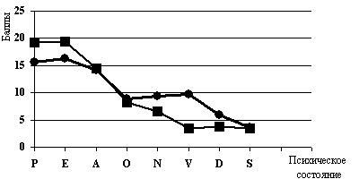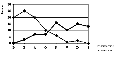 Рис. 2. Предстартовые состояния спортсменок, специализирующихся в беге на длинные дистанции, с высоким и низким результатами согласно методики субъективной оценки психических актуальных состояний СОПАС-8: Р - психическое спокойствие; Е - чувство силы и энергии; А - стремление к акции, действию; О - импульсная реактивность; N - психическое беспокойство, напряжение, V - опасения, тревога, тревожное ожидание; D - депрессия и изнуренность; S - удрученность, подавленность.