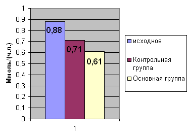 При оценке влияния ИВТ на основные показатели липидного обмена через 4 недели более выраженные по сравнению с контрольной изменения были отмечены у пациентов основной группы. Так, в группе пациентов, в лечении которых применялась ИВТ, статистически значимым оказалось снижение общего холестерина (с 6,6±0,55 до 5,1±0,54 ммоль/л), триглицеридов (с 2,6±0,48 до 1,4±0,78 ммоль/л) (р≤0,05); отмечены тенденция к снижению ЛПНП, коэффициента атерогенности и повышение ЛПВП по сравнению с контрольной группой (р≥0,05) (табл. 3). Таблица 3. Динамика показателей липидного профиля у пациентов с МС