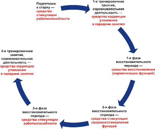 Введение. В настоящее время очевидно, что резервы увеличения подготовленности спортсменов высокого класса заключаются в практическом использовании внетренировочных и внесоревновательных факторов, влияющих на функциональное состояние спортсменов. К основным группам факторов относят подготовку в условиях среднегорья, высокогорья, искусственную гипоксию, подготовку в условиях высоких и низких температур, систему фармакологии и специального спортивного питания, учет десинхронизации и ресинхронизации циркадных ритмов, материально - техническое обеспечение подготовки, сохранение здоровья спортсменов [10]. Предпосылками эффективного использования представленных факторов может являться их группировка относительно цели тренировочного процесса. В этой связи в теории подготовки в олимпийском спорте выделяется группа внетренировочных средств. Внетренировочные средства - средства оптимизации срочной и долговременной адаптации организма, интенсификации тренировочного процесса, важный элемент специально организованного процесса реализации резервных возможностей специальной работоспособности и восстановительных реакций спортсменов в тренировочной и соревновательной деятельности. Применение таких средств может увеличить эффективность тренировочного процесса за счет определенного влияния на процессы стимуляции работоспособности и восстановления. Для современного процесса подготовки характерно широкое использование тренировочных занятий и микроциклов с большими нагрузками. Применение тренировочных нагрузок именно такого типа в наибольшей мере требует определенной системы использования средств предварительной стимуляции работоспособности и восстановления. Хорошо известно, что использование адекватных для целей конкретного занятия или микроцикла методов восстановления в период последействия больших тренировочных нагрузок является ключевым фактором получения максимального эффекта от проделанной тренировочной работы. В связи с этим, в современном спорте высших достижений рациональное планирование применения средств, стимулирующих работоспособность и восстановительных средств является актуальным и значимым компонентом системы подготовки спортсменов, важным составляющим профессионального мастерства тренера [7, 10]. Значительная доля современных исследований в спорте высших достижений связана с поиском и разработкой специальных стимулирующих воздействий. Такие воздействия применяются в период между тренировочными занятиями с большой нагрузкой или во время ответственной соревновательной деятельности. В этом случае важное значение приобретают постановка задач и выделение требований к организации тренировочного процесса и направленности средств подготовки в ударных и соревновательных микроциклах [3]. Одной из главных составляющих комплексного похода к этому вопросу является обеспечение эффективного перехода от процессов восстановления к стимуляции работоспособности и подготовке к предстоящей тренировочной и соревновательной деятельности. В практике спорта широко применяются специальные восстановительные программы тренировочных занятий с малой и средней нагрузкой в режиме переключения, активного отдыха и компенсаторной нагрузки. В то же время существующие подходы к испол