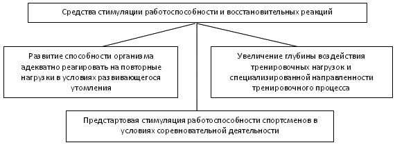 Рис. 1. Структурная схема применения внетренировочных средств, направленных на стимуляцию работоспособности и восстановления в подготовке квалифицированных спортсменов. Реализация такого подхода может быть основана при выполнении двух условий, выполнение которых обеспечивает эффективную интеграцию внетренировочных средств в тренировочный процесс. Первое условие - это эффективное сочетание внетренировочных средств преимущественной и комплексной направленности [11,12]. Второе условие - формирование содержания занятия или серии занятий основано на интеграции тренировочных и внетренировочных средств единой направленности. Внетренировочные средства преимущественной направленности применяются в процессе предстартовой стимуляции работоспособности. Они имеют выраженную целевую направленность и влияют на мобилизацию функций организма, определяющих проявления специальной выносливости. Примером такого рода являются внетренировочные средства, направленные преимущественно на стимуляцию аэробной или анаэробной функции организма. В этой связи показаны возможности различного сочетания интенсивных упражнений с партнером и приемов мобилизационного массажа, а также различных режимов тренировки дыхательных мышц. Режимы тренировки дыхательных мышц могут иметь преимущественно аэробную или анаэробную направленность [6]. Систематизация результатов теоретического анализа и результатов экспериментов позволили сформировать концепцию, в основе которой лежит комплексное применение тренировочных и внетренировочных средств, направленных на стимуляцию работоспособности и восстановления в структурных единицах макроцикла подготовки спортсменов. Системное применение внетренировочных воздействий с учетом целевых установок спортивной подготовки является фактором обеспечения реализационного эффекта тренировочных и соревновательных нагрузок и, как следствие, фактором увеличения результативности соревновательной деятельности в спорте высших достижений. Эффективное построение тренировочного процесса (соревновательной деятельности) может быть основано на формировании комплексов внетренировочных и тренировочных средств, интегрированных в интегрированных в единые циклы "средства стимуляции работоспособности-средства коррекции утомления в процессе тренировочного занятия (соревновательной деятельности) - средства восстановления (нормализации) функций - средства стимуляции сверхвосстановления функций - средства стимуляции работоспособности - средства коррекции утомления в процессе тренировочного занятия (соревновательной деятельности)" в условиях чередующихся занятий (этапов соревнований) с большими нагрузками.