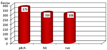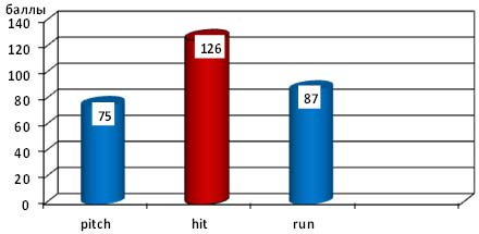 Такой положительный прирост показателей КС и технико-тактической подготовленности бейсболистов, является результатом правильного подхода в отношении формирования КС, основанного на упражнениях с цветными мячами и бейсбольной "пушки", составляющими основные компоненты условий соревновательной деятельности, что подтверждается результатами тестов "pitch, hit and run" по оценке технической подготовленности после эксперимента (рис. 2). Следует учитывать, что результаты этих тестов до эксперимента имели низкий уровень по всем показателям "pitch, hit and run".