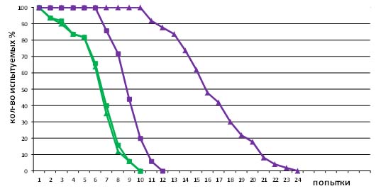 Таким образом, экспериментальный подход акцентированного развития координационных способностей юных бейсболистов способствовал существенному изменению показателей, характеризующих координационные способности по пространственно-временным, силовым и динамическим характеристикам, а так же технико-тактического мастерства. Исходя из полученных данных, представляется актуальным необходимость провести анализ динамики ошибок при выборе правильного атакующего действия у бейсболистов до и после эксперимента. На рисунке 3, представлена динамика ошибок у бейсболистов контрольной и экспериментальной групп до и после педагогического эксперимента. Анализ показал следующие результаты: до эксперимента с первой попытки без ошибок выполнили 100% бейсболистов контрольной группы, максимальное кол-во попыток без ошибок составило 9; после эксперимента на протяжении 6 попыток выполняли без ошибок 100% бейсболистов контрольной группы, максимальное кол-во попыток составило 11; результат до эксперимента у бейсболистов экспериментальной группы составил 100% без ошибок с первой попытки, максимальное кол-во попыток составило 9; бейсболисты экспериментальной группы без сбоев выполнили 10 попыток, максимальное кол-во попыток составило 23.
