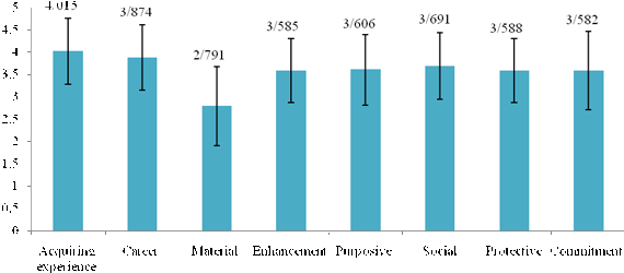 * Significant difference in P≤0.05 Regarding the results of tables 2 and 3 (repeated measurement test), it can be observed that there is a meaningful difference between priorities of universities ‘sport administration managers’ leadership styles. Transformational leadership style (3.723+0.683) is in the first priority and transactional leadership style (3.476+0.572) and laissez-faire (2.827+0.833) are in the second and third priority. From volunteer students’ point of view, satisfaction of acquiring experience, career, and social are the most important and material satisfaction is the least important dimension of sport associations’ volunteers’ satisfaction (figure 1). Figure 1, Comparison importance dimensions sport volunteers' satisfaction Conclusion and discussion The purpose of this research is to study the relation between universities sport administrations managers’ leadership style and universities sport associations volunteers satisfaction. The results of this study show that there is a positive and meaningful relation between transformational leadership style and volunteers satisfaction (r=0.341; P<0.05), negative and meaningful relation between laissez-faire leadership style and volunteers satisfaction (r=-0.355; P<0.05). Also, there is no meaningful relation between transactional leadership style and volunteers satisfaction. Studies show that in transformational leadership style, the leader, encourages the subjects in order to reach their maximum potential power and this makes them to satisfy their higher levels of needs (success and self-recognition), and group goals. Mahate (2005) shows in his study that to have higher satisfaction levels and better function, bank managers need to use transformational leadership style (13). The results of the studies of Mary ClaireKlein (2006), Charles Emery et al. (2007), Fang et al. (2009), Rowold (2009), Korek, S., Felfe, J., Rothe (2010), are similar to those of this study. The results of this study show that the tendency among sport administration managers leadership style is toward transformational, transactional, and then laissez-faire. Charles Emery et al. (2007), indicate that transformational leadership has higher relation with job satisfaction and organizational commitment than transactional leadership. This study’s results agree with the results of Tuker’s (1992) research results. In contrast with the results of this study, Susan B. Pettine (2006) shows in her study that transformational leadership has no privilege over transactional leadership in using voluntary forces (23). Rejas et al. (2006) studied the effect of leadership style on the performance of small companies in Chile. They reported that transformational leadership was in the middle, transactional leadership was in the highest, and laissez-faire leadership was in the lowest level of leadership styles. It seems that, among the reasons that this study doesn’t compatible to that of Doherty (1997), Ceroy & Danylckuk (1996), Pruijn & Boucher (2002), Rejas et al (2006) are the difference between statistical population, cultural differences, and the difference between environments used by these researchers and those of sport administration. Transformational leadership style, because of considering individual’s morale and values, and driving their inner motivations, has a great impact on human resource management especially in sport management sector. Those sport officials who adopt this style, are recognized as successful leaders and have a great impact on their followers. Thus, universities sport administrations managers, through transformational leadership, can affect the level of sport associations’ volunteers’ satisfaction and the effectiveness of sport activities under their control. Also, the results of this study show that the priority of volunteers satisfaction dimensions are experiencing satisfaction, career, social, purposeful, protective, progress, commitment, and material. In this study, volunteer students of the universities sport associations introduce experiencing as the most important and material satisfaction as the least important dimensions of satisfaction. Farrell et al. (1998) and Ghazali (2003) introduce satisfaction from experiencing as the last priority of volunteers’ satisfaction which is in contrast with the results of this study (24, 25). Also, the results of this study show that the priority of volunteers satisfaction dimensions are experiencing satisfaction, career, social, purposeful, protective, progress, commitment, and material. In this study, volunteer students of the universities sport associations introduce experiencing as the most important and material satisfaction as the least important dimensions of satisfaction. Farrell et al. (1998) and Ghazali (2003) introduce satisfaction from experiencing as the last priority of volunteers’ satisfaction which is in contrast with the results of this study (24, 25). As one of the reasons for this contradiction, we can mention the difference in the nature of this study’s statistical population and of two others; because voluntary activity of their studies is eventual and short term, but in this research it is long term. Choosing satisfaction from experiencing as the most important dimension of satisfaction shows volunteers’ high level of satisfaction from experiences they have acquired in universities sport associations. The reason of this fact is that sport activity in the association is long term in nature. Sport association provides the students an opportunity to experience and use their experiences in their sport and work life. Elstad (1996) showed material satisfaction as a relatively important factor in volunteers’ satisfaction. Farrel et al. (1998) also, introduced this factor as the most important factor of volunteers’ satisfaction which was not compatible to this research finding. This study illustrates that girls are more satisfied than boys in all sati