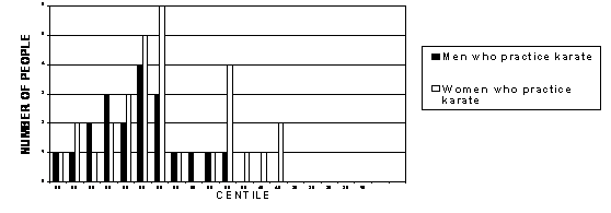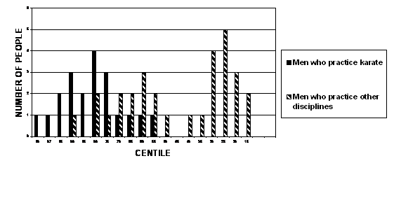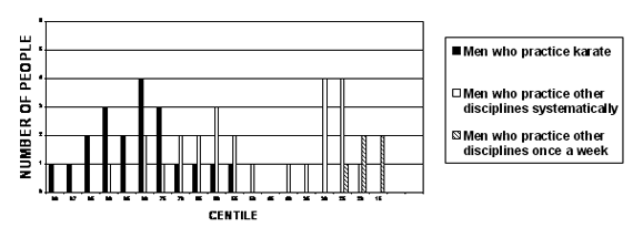 Bar chart 2. The collation of the results of assertiveness level obtained by women who practice karate and women who practice other disciplines three times a week and women who practice other disciplines once a week. The results presented in the bar chart above, concerning women who practice other sport disciplines than karate, were divided into groups according to the number of trainings every week. It can be concluded that the number of trainings exerts a direct influence on the level of assertiveness obtained by those people. Women who practice regularly, at least three times a week or even more often, are characterized by a much higher level of assertiveness in comparison to women who practice on regular basis, but who restrict themselves to only one training every week. It should be noticed that people who practice different sport disciplines at least three times a week obtained results at the level between 40 and 55 centiles, which is only the lower borderline of the assertiveness level for people who practice karate. Bar charts number 3 and 4 are devoted to the characteristics of the assertiveness level results obtained by men. Bar chart number 3 contains the results of assertiveness level among men who were subdivided into groups who practice karate and men who do other sport disciplines. Bar chart 3. The collation of the assertiveness level of men who practice karate and men who practice other sport disciplines The research conducted in the group comprised by men who practice karate and other sports disciplines, similarly to the group of women, show significant differences in the level of assertiveness in favour of karate adepts. The level of assertiveness among men who practice karate was between 40 and 99 centiles, while the level obtained by men who do other sport was relatively lower - from 15 to 90 centiles. A half of the men who do other sport disciplines reached the results between 15 and 40 centiles. Bar chart number four presents data about the assertiveness level among men who practice karate and other disciplines concerning the division into men who practice regularly, at least three times a week, and those whose training takes place only once a week. Bar chart 4. The collation of the results of assertiveness level obtained by men who practice karate and men who practice other disciplines three times a week and men who practice other disciplines once a week. Comparing the group of men who practice different disciplines, considering the division into groups taking into consideration the frequency of training, it should be concluded that there is a huge difference in the assertiveness level in favour of men who practice sport systematically - the results oscillate between 20 and 90 centiles. Men who train only once a week obtained the result at the level between 15 do 25 centiles. It should be acknowledged that people who train other sport disciplines at least three times a week obtained lower results than men who practice karate. Bar chart number 5 presents the collation of the results of assertiveness level taking into consideration the sex of respondents. Bar chart 5. The level of assertiveness among the karate adepts surveyed considering their sex The analysis of the results of the assertiveness level among men and women shown, that men are more assertive than women and they obtain higher results than women as well. Men’s results oscillate between 55 and 99 centiles, women’s results are between 40 and 99 centiles. The last bar chart is a collation of the assertiveness level among people who practice other sport disciplines considering their sex. Bar chart 6. The results of the assertiveness among women and men who practice other sport disciplines The analysis of the results of assertiveness among women and men who practice different sport disciplines revealed that men are more assertive in comparison to women and they achieve higher results than women as well. The results of men’s assertiveness oscillates between 15 and 90 centiles, women’s assertiveness oscillates between 5 and 55 centiles. The comparison of own research to norms and results. Questionnaire form based on the Rathus Assertiveness Scale was applied as the tool in this research, whereas each question posed to the respondents was presented on a scientific scale. The scale accepted (3 - yes it definitely refers to me; 2 - refers to me; 1 - rather refers to me; -1 - rather does not refer to me; -2 - does not refer to me; -3 - definitely does not refer to me) was used to examine the respondents’ attitudes and reactions to those situations in which assertiveness can be manifested. The differentiation gave the researchers an ample opportunity to quantify disparities in the meaning of particular terms among people who practice karate. It facilitated the process of determining the emotional component of attitudes towards different objects, gave an opportunity to asses the intensity of different emotional components of assertiveness and its cognitive structure. Table 2 contains the results concerning the level of assertiveness among women who practice karate and those who practice other disciplines compared with norms. Table 2. The collation of the results obtained by women who practice karate and women who practice other disciplines
