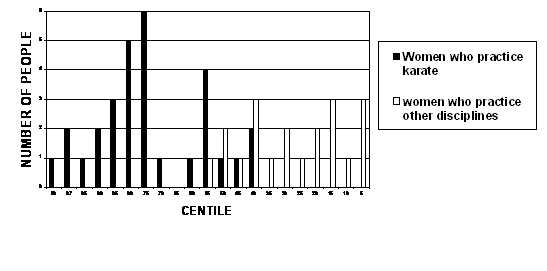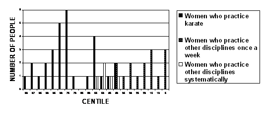 Then, statistical inference concerned with the nature of assertiveness among the populations surveyed was performed. 123 people were surveyed in this examination, however, the questionnaires of 100 respondents were qualified in this paper. This number is comprised by 50 people who practice karate and 50 respondents who practice other disciplines. The respondents who are into karate came from the biggest karate clubs in Poland, where the greatest number of adepts train in the senior category: Bushi in Bydgoszcz, Kaisho in Bialystok and Dynamic from Poznan. All the persons who practice both karate and other sport disciplines were students of Physical Education. The group of karate adepts was comprised by 20 men and 30 women. The second group of respondents consist of 20 women and 30 men. Results The results presented on the first and the second bar charts are characteristics of women’s assertiveness level in different configurations. Bar chart number one depicts the level of assertiveness considering the division into women who practice karate and women who perform other sport disciplines. Bar chart. 1. The results of examinations among women who practice karate and other disciplines Comparing the results of the level of assertiveness gained among women who practice karate and those who practice other sport disciplines, it can be unambiguously concluded that women who are into karate are characterized by a far more higher level of assertiveness than women who do other sports. The assertiveness declared by women who practice karate is at the level between 40 and 99 centiles, compared to women who do other sports disciplines who achieved results at the level between 5 and 55 centiles on the Rathus Assertiveness Scale. Bar chart number two presents data concerning the level of assertiveness among women who practice karate and women who perform other disciplines divided taking into account the frequency of their trainings: women who train regularly (three and more times a week) and those who do it once a week.
