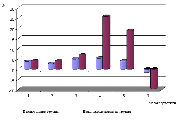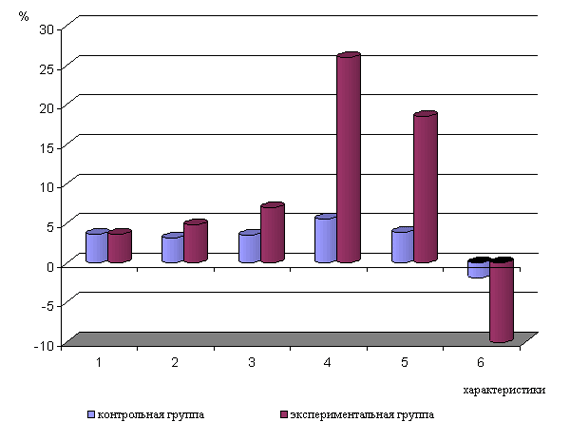 Как свидетельствуют полученные результаты (табл.1.), у мальчиков КГ и ЭГ групп происходит рост угловых и линейных характеристик сагиттального профиля стопы, но качественные показатели в обеих группах разные. Так по завершению эксперимента длина опорной части стопы увеличивается у мальчиков ЭГ на 5,43 мм, а в КГ на 5,15 мм. Высота голеностопного сустава у мальчиков ЭГ растет на 2,4 мм, а в КГ на 1,7 мм . Рост высоты верхнего края ладьевидной кости у мальчиков ЭГ составляет 2,72мм, а в КГ только 1,96 мм. Анализ динамики угловых характеристик сагиттального профиля стопы у мальчиков КГ и ЭГ свидетельствует о следующем: плюсневый угол бы растет в ЭГ на 6,19 град., а в КГ только на 1,15 град. Пяточный угол в растет в ЭГ на 5,8 град., а в КГ только на 1,12 град. Угол грамма уменьшается у мальчиков ЭГ на 12,0 град., а в КГ только на 2,2 град. У девочек КГ и ЭГ в динамике исследуемых характеристик происходит почти аналогичная картина, за исключением качественных показателей. Так у девочек ЭГ и КГ длина опорной части стопы растет на 4,7мм и 4,71 мм соответственно. Высота голеностопного сустава у девочек ЕГ растет на 2,94 мм, а в КГ только на 1,88 мм. Рост высоты верхнего края ладьевидной кости у девочек ЭГ составляет 2,68мм, а в КГ только 1,3 мм. Анализ динамики угловых характеристик сагиттального профиля стопы девочек (табл. 1.), свидетельствует, что плюсневый угол растет в ЭГ на 6,31 град, в а КГ только на 1,21 град. Пяточный угол растет в ЭГ на 5,98 град., а в КГ только на 1,18 град. Увеличение углов альфа и бета закономерно приводит к уменьшению угла гама -у девочек ЭГ он уменьшается на 12,3 град., а в КГ только на 2,39 град. С целью более качественного анализа динамики показателей сагиттального профиля стопы детей младшего школьного возраста, мы определили темп их прироста. Для удобства анализа, полученных результатов мы представили их в графическом виде (рис.2.-3.). Как видно из графика (рис.2.), у мальчиков младшего школьного возраста исследуемые показатели имеют разные темпы прироста. Так прирост длины опорной части стопы у мальчиков КГ составляет 3,8 %, а в ЭГ - 4,0 %. Прирост высоты голеностопного сустава у мальчиков КГ составляет 2,7 %, в ЭГ - 3,9 %. Примечание: 1 - длина опорной части стопы, мм; 2 - высота голеностопного сустава, мм; 3 - высота верхнего края ладьевидной кости, мм; 4 - плюсневый угол альфа, град; 5 - пяточный угол бэта, град; 6 - угол грамма, град. Рис. 2. Темпы прироста показателей сагиттального профиля стопы мальчиков младшего школьного возраста У мальчиков КГ прирост высоты верхнего края ладьевидной кости составляет 5,0 %, в то время как в ЭГ этот показатель больше - 6,9 %. Прирост плюснового угла альфа у мальчиков КГ составляет 5,4 %, а в ЭГ прирост значительно больше и составляет 25,8 %. Почти аналогичная картина наблюдается и с приростом пяточного угла бэта - у мальчиков КГ он составляет 3,9 %, а в ЭГ - 18,7 %. Увеличение углов альфа и бэта закономерно приводит к уменьшению угла гама, у мальчиков КГ этот показатель составляет 1,7 %, а в ЭГ - 9,6 %. Анализ темпов прироста показателей сагиттального профиля стопы у девочек младшего школьного возраста (рис.3.), свидетельствует о следующем: темпы прироста длины опорной части стопы в КГ и ЭГ одинаковы и составляют 3,6 %. Темп прироста высоты голеностопного сустава у девочек КГ - 3,1 % а в ЭГ показатель более высок и составляет 4,8 %. Существенные отличия в темпах прироста высоты верхнего к