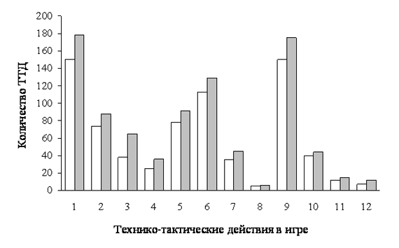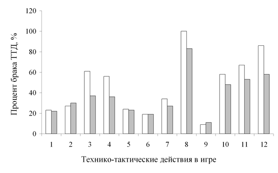 1 - помехи, 2 - перехват, 3 - отбор, 4 - единоборства вверху, 5 - подбор, 6 - короткие, средние передачи; 7 - длинные передачи, 8 - острые передачи, 9 - передачи назад, 10 - обводка, 11 - атака с фланга, 12 - удар по воротам Рис. 3. Процент брака ТТД в контрольном и экспериментальном матче