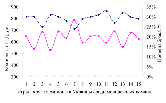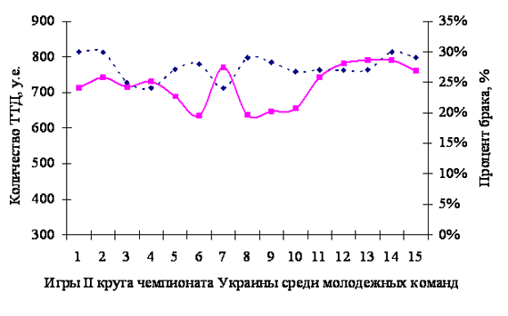 Рис. 5. Изменение количества и процент брака ТТД в течение 1-15 игры I круга - - - - - - - процент брака количество ТТД; На рисунке 6 представлено соотношение количества ТТД и количества брака, показано изменение соотношения этих показателей в течение 1-15 игры II круга. На рисунке 6 в процессе анализа ТТД отчетливо видны два периода устойчивой высокоэффективной соревновательной деятельности. Одновременно необходимо отметить эффективность соревновательной деятельности на начальном отрезке второго круга, было выиграно подряд 5 матчей. После этого в течение шести туров достигнута одна победа (7 тур). Далее с 12 по 14 тур были одержаны три наиболее важные победы в чемпионате, которые в наибольшей степени оказали влияние на достижение достаточно высокого спортивного результата.